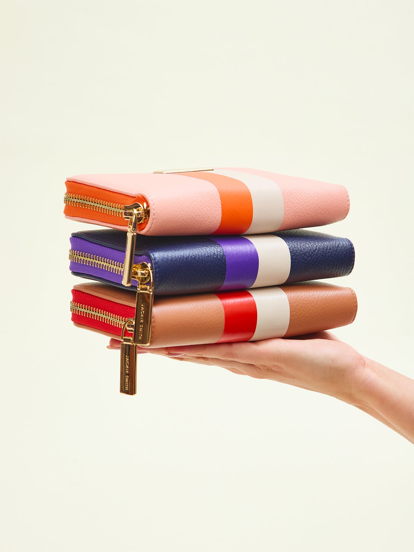 Confeccionada en cuero graneado con nuestras signature stripes estampadas en serigrafía, esta billetera revela un juego de textura y precisión que habla de elegancia contemporánea. Su silueta depurada se realza con el herraje metálico aplicado en el frente, mientras que sus demás herrajes bañados en oro aportan un destello contenido y sofisticado. Su interior despliega una organización impecable: doce compartimientos para tarjetas, dos divisiones para billetes y un bolsillo con cierre que resguarda con discreción. Una pieza que encarna el espíritu de Jackie Smith: vibrante, bella y naturalmente elegante.