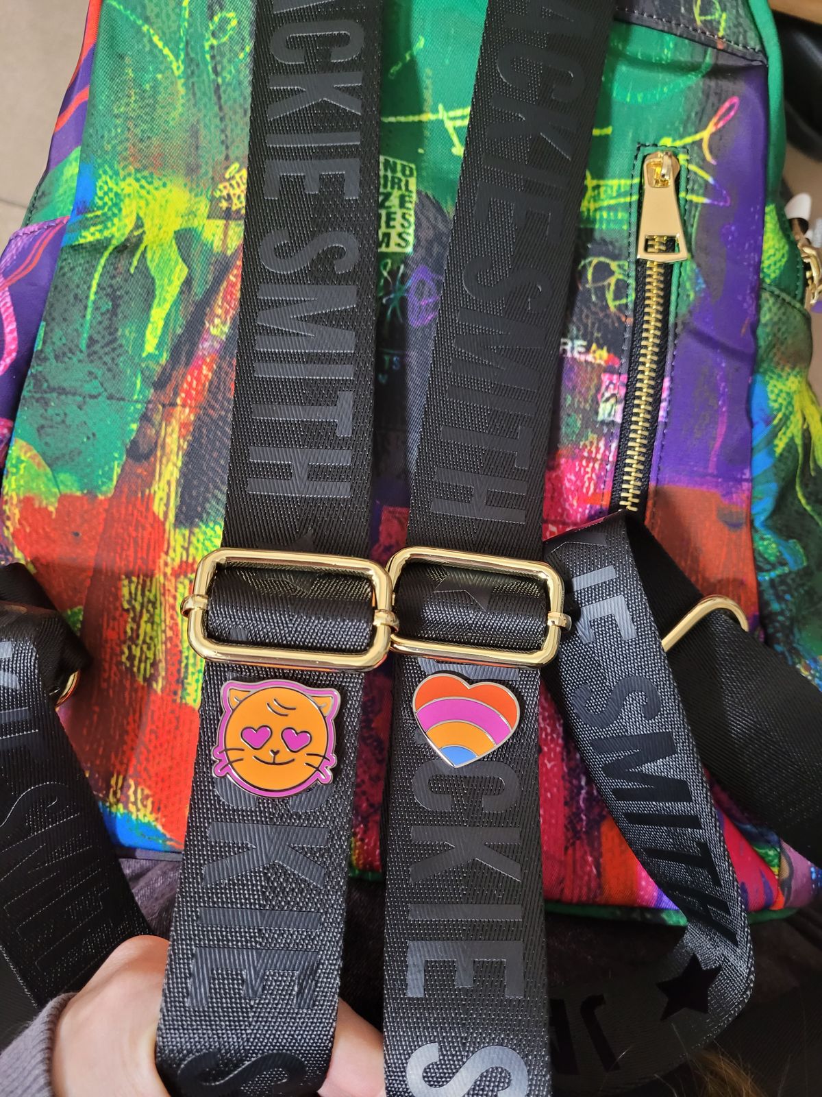 Esmaltados, coloridos, pequeños objetos de deseo para personalizar tus prendas o bolsos. Nuestros pins esmaltados forman parte del universo lúdico de Jackie. Fueron diseñados con un cierre mariposa en la parte posterior que garantiza que sean fáciles de poner, sujetar y quitar. Todos juntos o por separado evocan una forma contemporánea de lujo: alegre, personal y exquisitamente cuidada.
