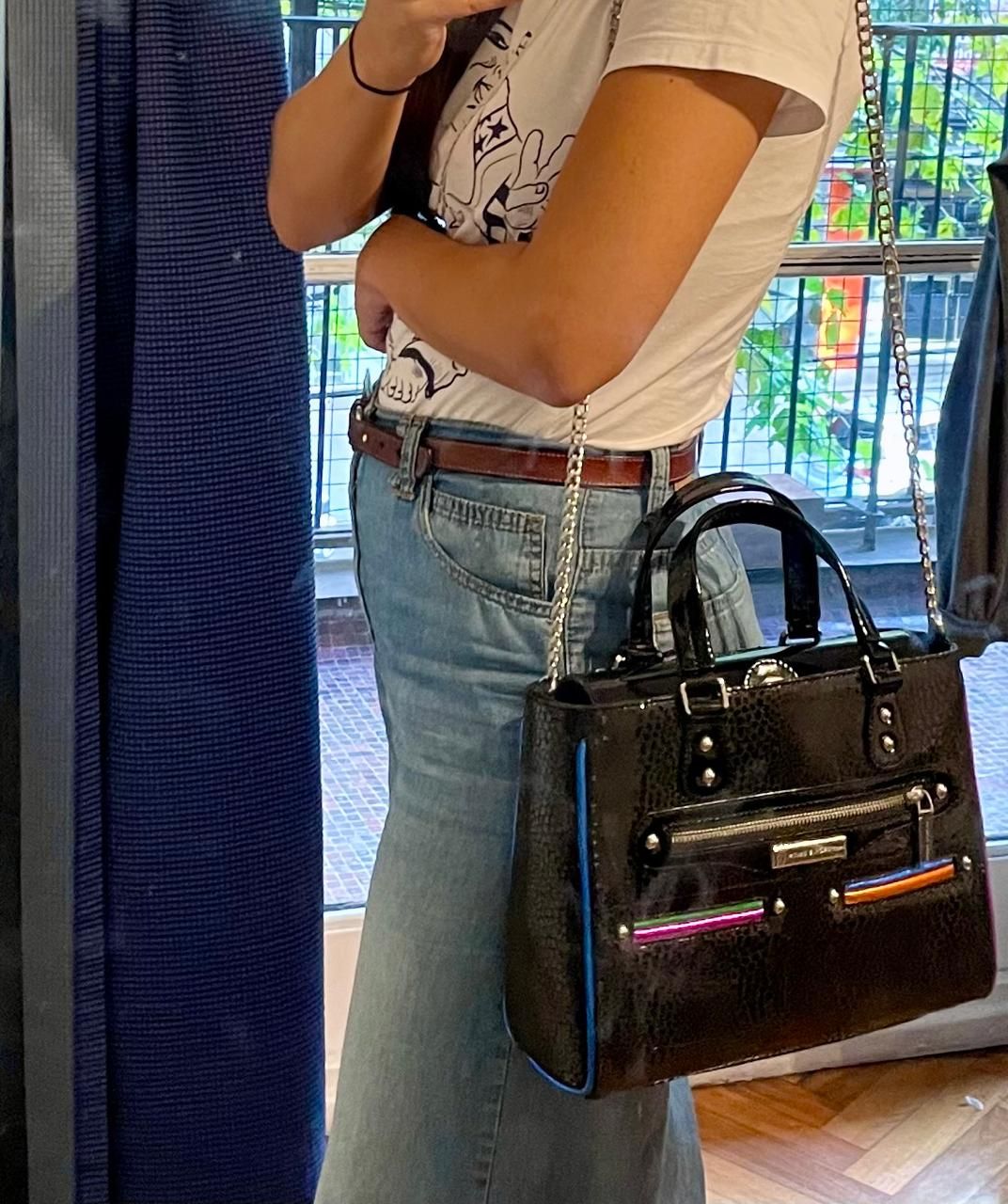 La cadena de la cartera se une con una argolla al cuerpo de la misma. La argolla es muy fina, el espesor de la misma permite que el eslabón de la cadena se salga, dado que está abierto y la cartera se caiga al piso.