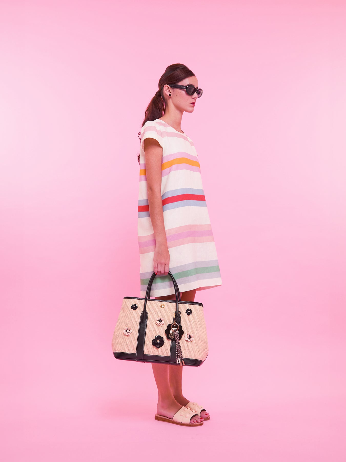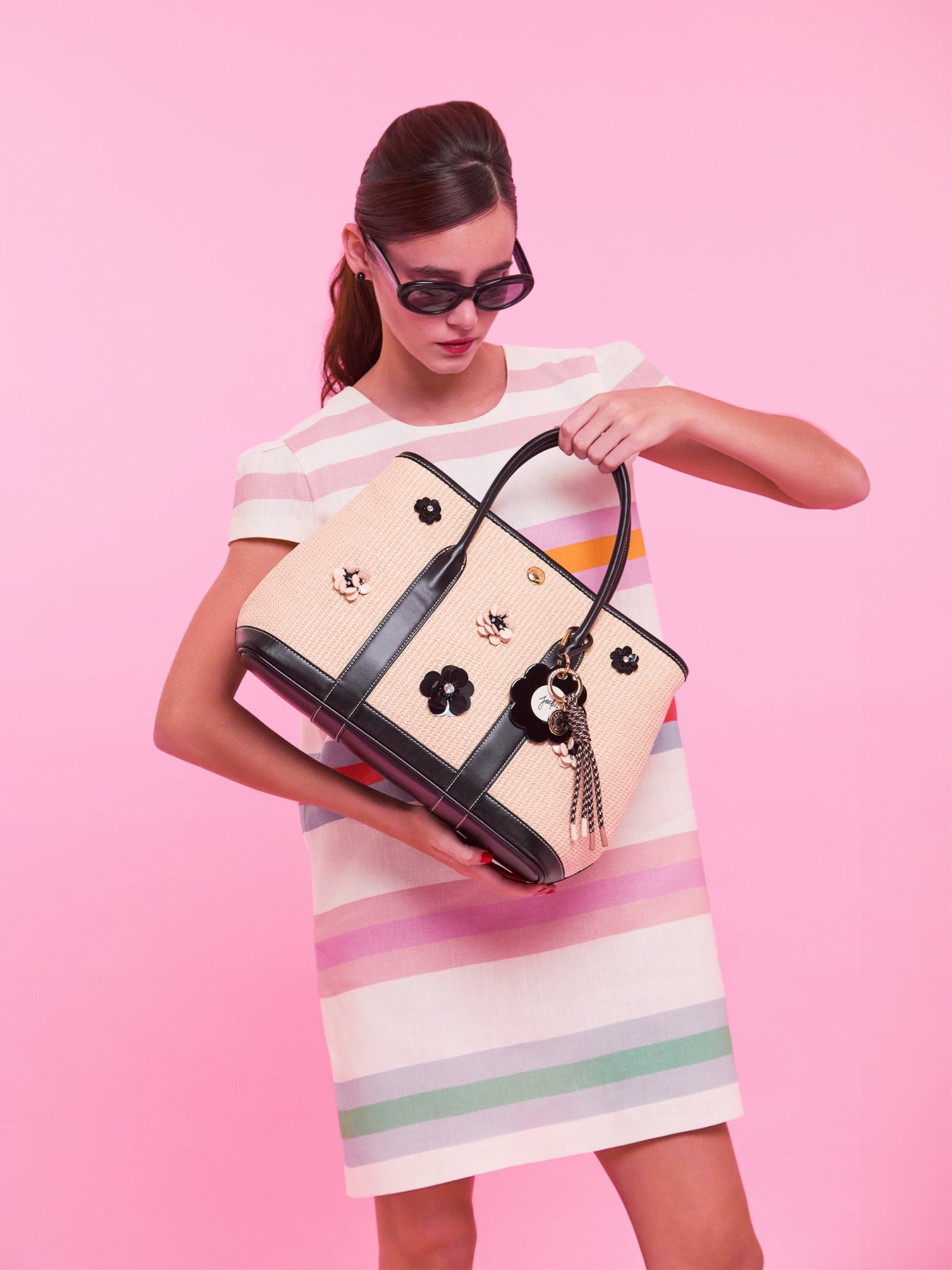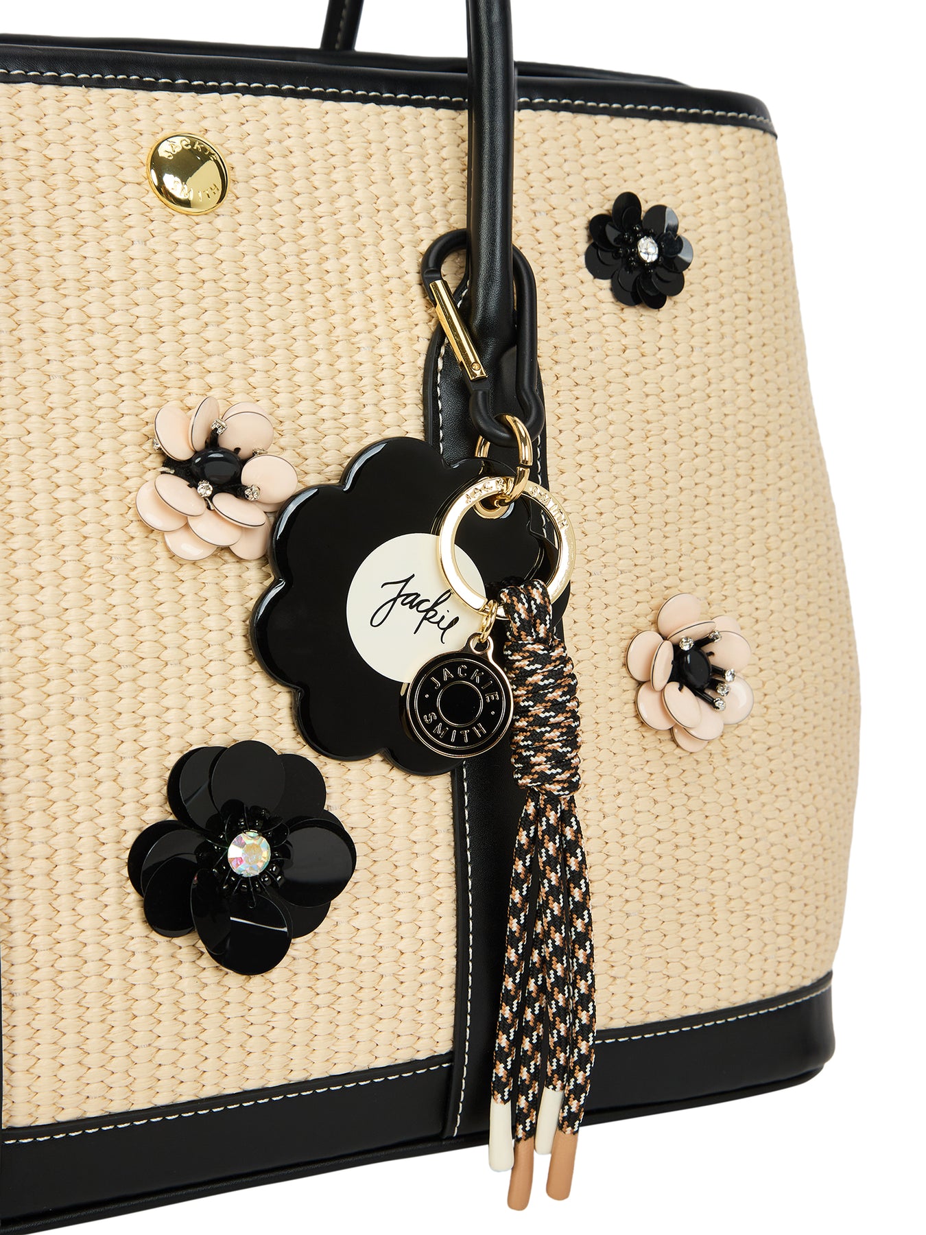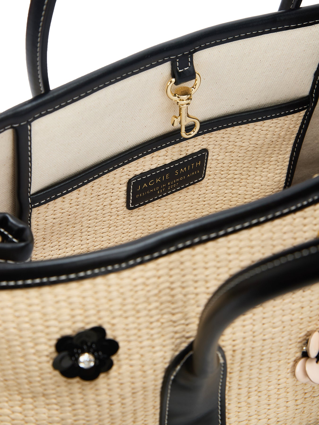 En esta edición, Grace reinterpreta su silueta en PU raffia, con un delicado trabajo de apliques que florecen sobre su superficie como una evocación de la calidez y la gracia de los días estivales. Cada pétalo, cada destello, traduce la energía del verano en una expresión táctil y femenina. Las terminaciones en PU y los herrajes bañados en níquel aportan definición y un brillo sutil que realza la textura natural del material. En su interior, el canvas de algodón revela una organización práctica y serena, pensada para acompañar los días luminosos con elegancia relajada. Una pieza que captura el espíritu resort de Jackie Smith: alegre, refinada y eternamente ligada al encanto de la temporada.