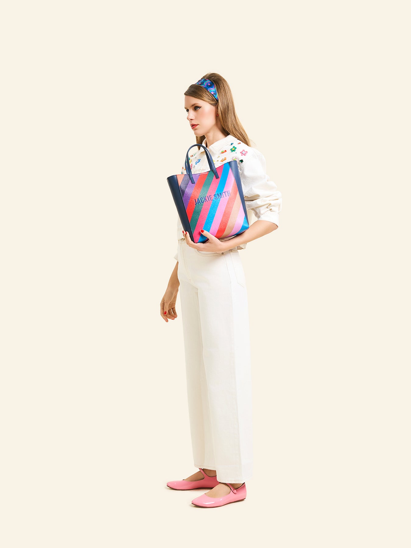 Inspirada en las escenas urbanas y nuestra conexión con el diseño gráfico y el color, nace esta Colección. Confeccionada en PU grabado, esta tote bag liviana y versátil destaca por nuestro signature print de rayas oblicuas multicolores. Su strap regulable y removible te permite llevarla al hombro o cruzada, para lograr el calce perfecto. Este producto cierra con broche imán y presenta un bolsillo colgante con cierre . Power Up! Corita is here to stay!