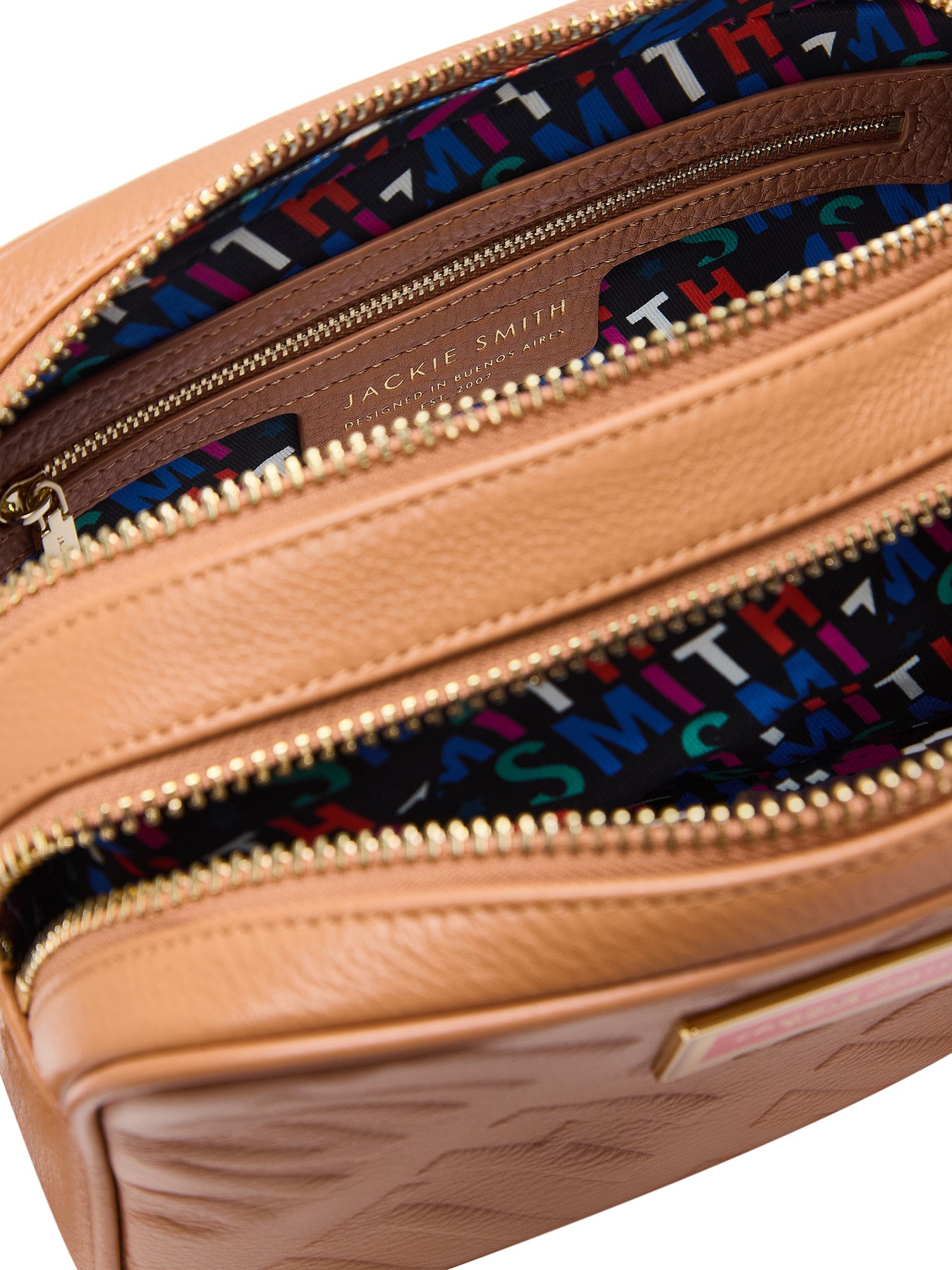 Confeccionada en cuero graneado gofrado, la textura de Simona revela la precisión de un trabajo artesanal pensado para acompañar el ritmo contemporáneo con gracia y personalidad. Su ribbon —removible y regulable— tejida con hilos de lúrex introduce una nota vibrante y sofisticada, mientras los herrajes bañados en oro y el acceso con doble cierre aseguran un acabado impecable. En su interior, forrado en gabardina custom print, los bolsillos multifunción y con cierre completan una estructura tan práctica como refinada. Un diseño versátil que conjuga carácter, brillo y elegancia en dosis exactas.
