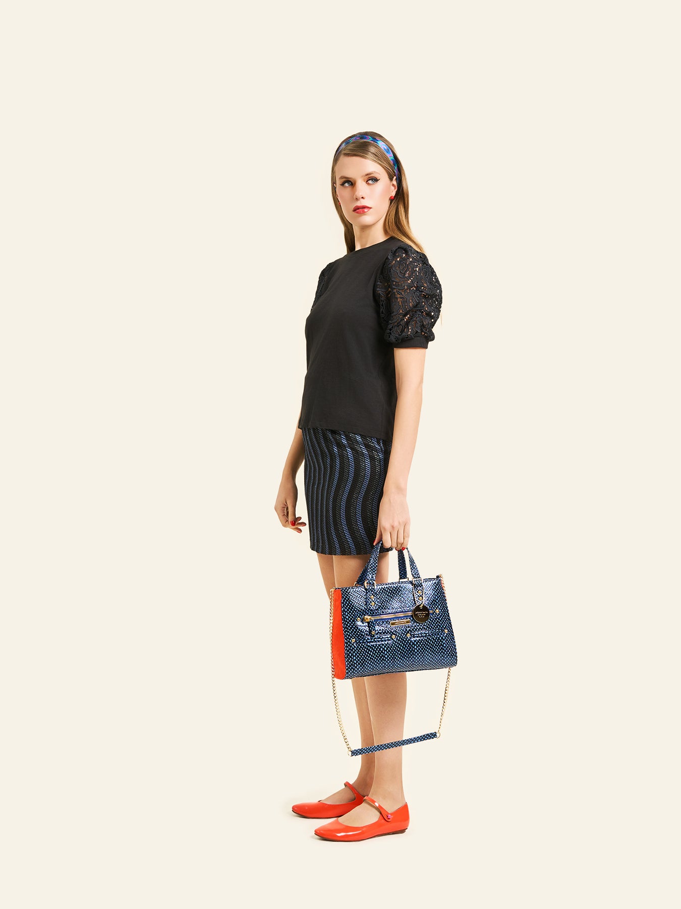 Una tote bag de líneas estructuradas y carácter versátil, que forma parte de una edición limitada de piezas manufacturadas en Buenos Aires a partir de materias primas italianas, especialmente seleccionadas por su belleza. Confeccionada en cuero grabado con efecto pitón levemente metalizado, revela detalles inesperados en sus fuelles en gamuza vibrante. Su interior, forrado en gabardina rayada, ofrece organización discreta con compartimentos funcionales. Los herrajes bañados en oro y la cadena dialogan con la superficie texturada en un contraste sutil entre sofisticación y energía. Una pieza pensada para acompañar la rutina con elegancia urbana y espíritu lúdico, sea que elijas llevarla al hombro o en la mano, para un look ladylike.