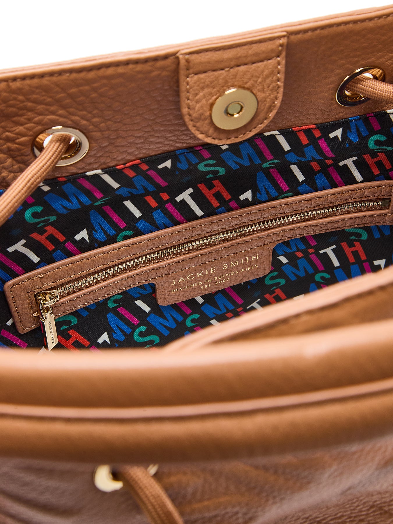 Confeccionada en cuero graneado y gofrado, este hobo bag de generosas proporciones y aspecto sofisticado es versátil y acompaña tus looks de día y de noche por igual. Podés optar por llevarla al hombro o cruzada, haciendo uso de su hermosa strap tejida en lúrex.