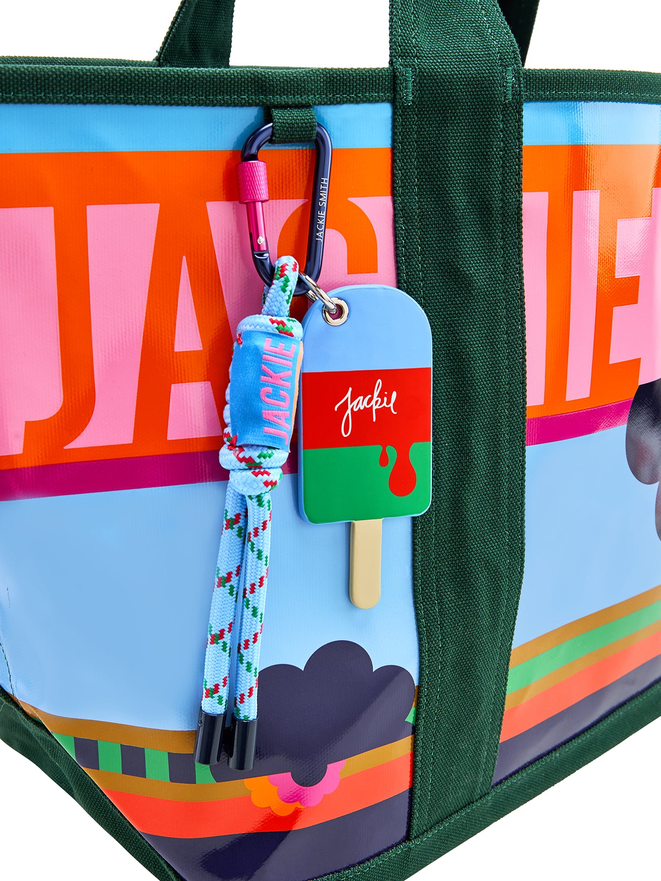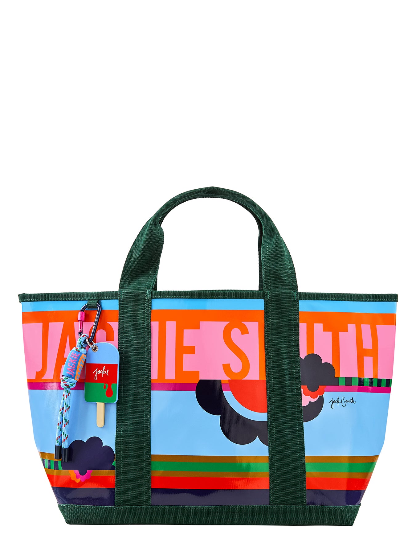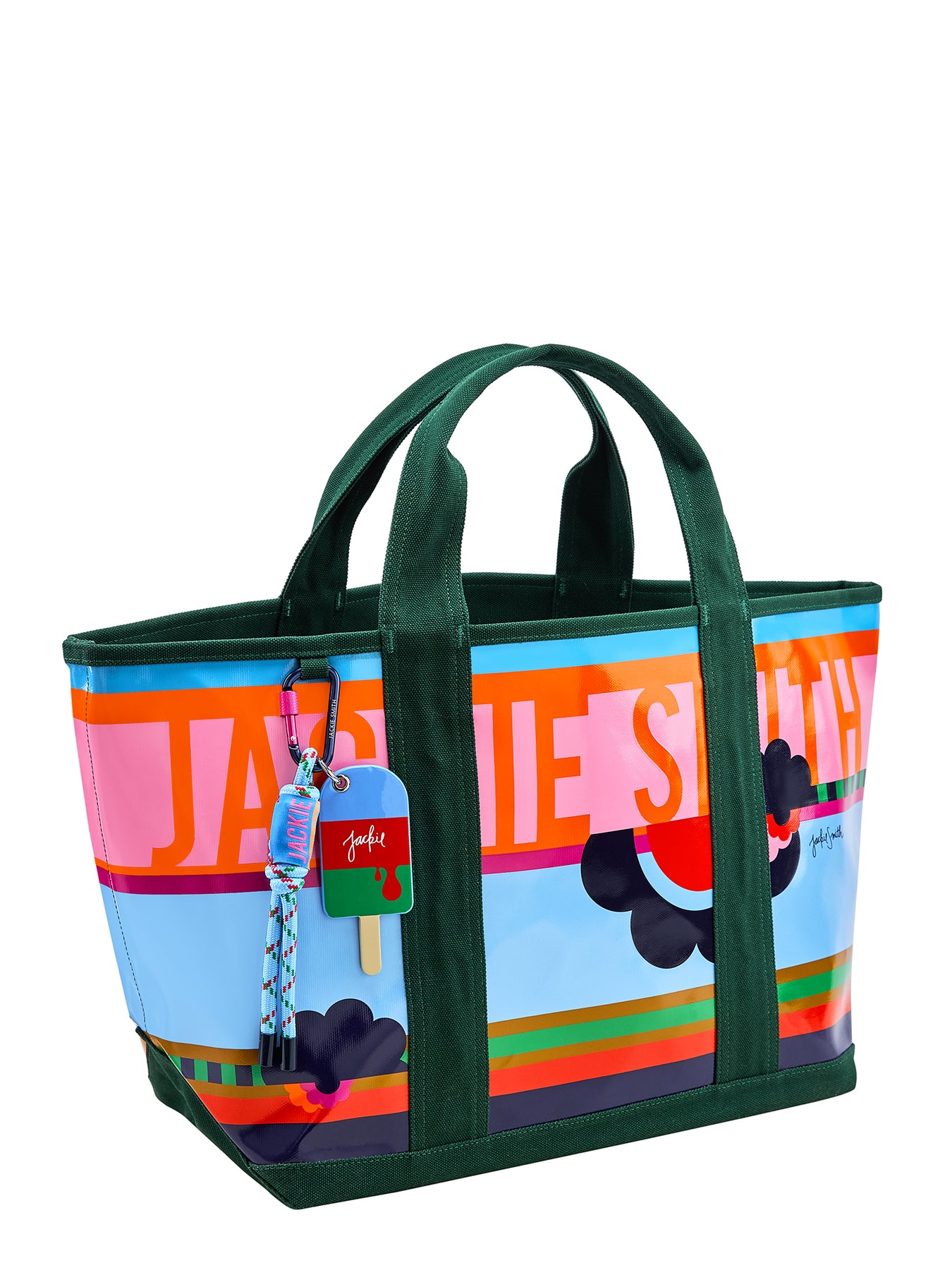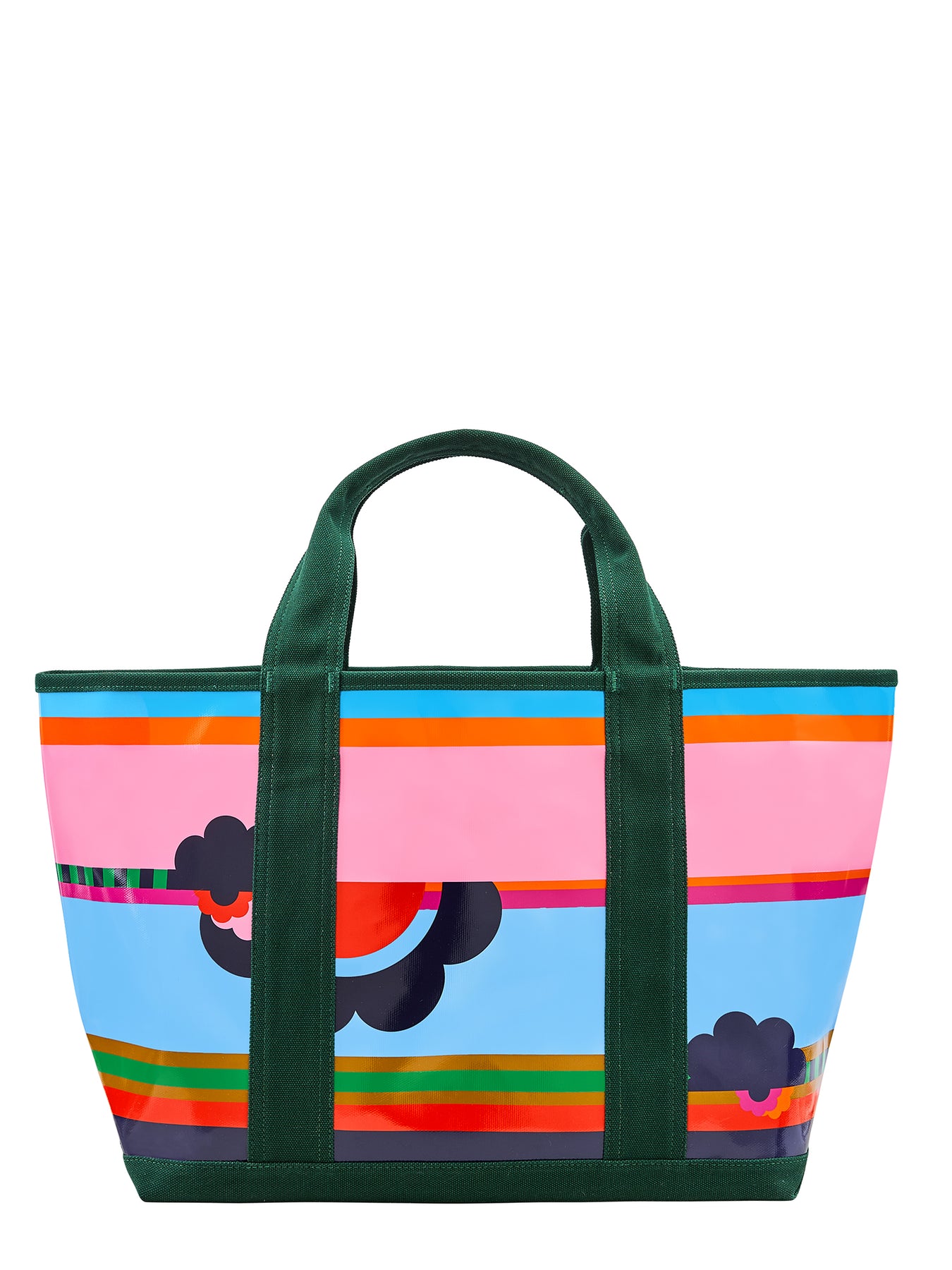 Un shopping bag urbano, liviano y atemporal. Confeccionado en canvas de algodón, con interior impermeable y una hermosa estampa de rayas multicolores realizada en serigrafía, este bolso es perfecto para que lo uses a lo largo del año. Su interior espacioso puede contener todo lo que necesites para el día, un fin de semana en la playa o como parte de tu equipaje de mano. Sus asas superiores te permiten llevarlo cómodamente al hombro.