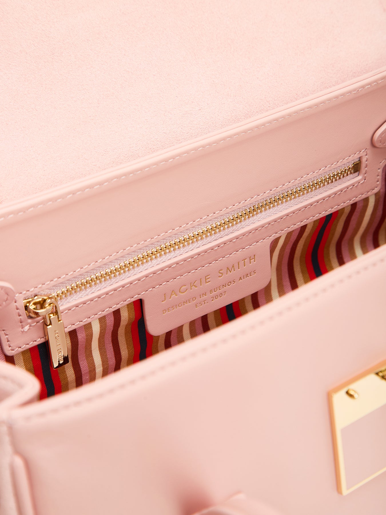 Una silueta precisa que combina estructura y suavidad en perfecto equilibrio. Confeccionada en cuero box con detalles en gamuza, esta baguette revela una lectura contemporánea del oficio: líneas puras, acentos táctiles y una composición de contrastes sutiles. Su cerradura esmaltada con herrajes bañados en oro aporta una nota de brillo contenido, mientras los fuelles con cinto regulable refuerzan su espíritu funcional sin perder refinamiento. En el interior, la gabardina rayada de algodón resguarda una organización impecable con bolsillos internos —uno con cierre y otro multifunción— pensados para acompañar el ritmo cotidiano con elegancia natural. Una pieza que evoca el espíritu de Jackie Smith en un gesto de modernidad, precisión y belleza atemporal.