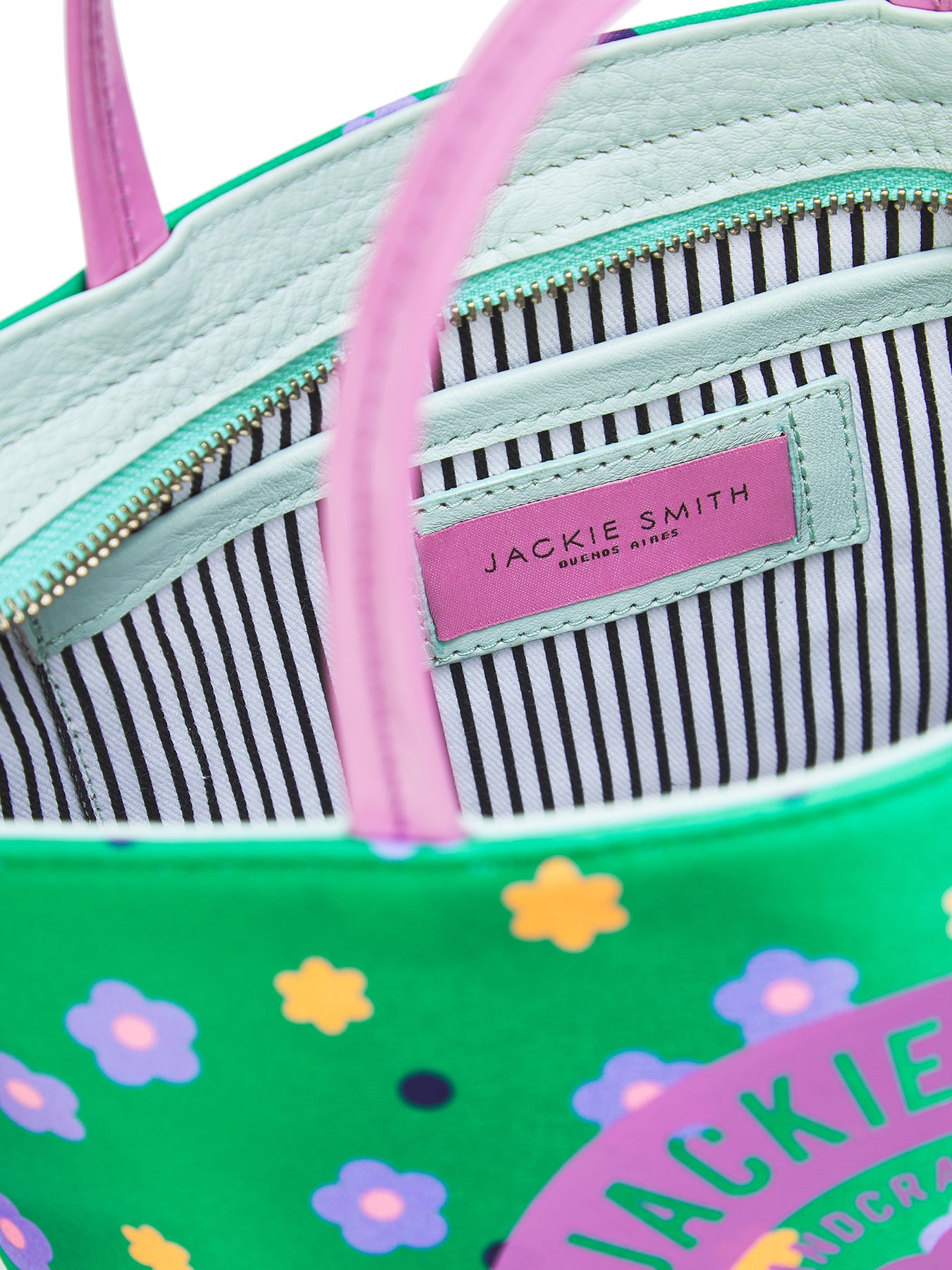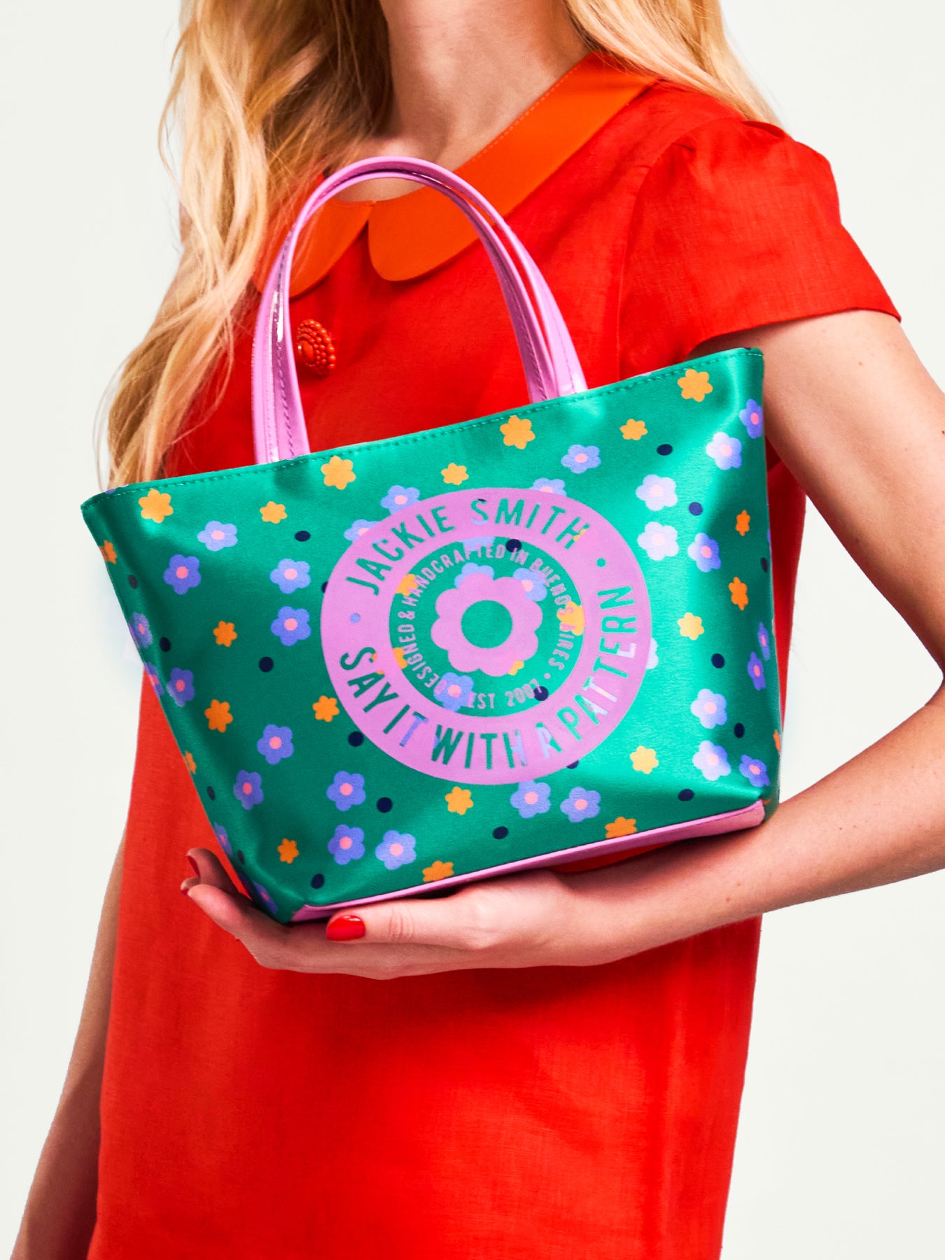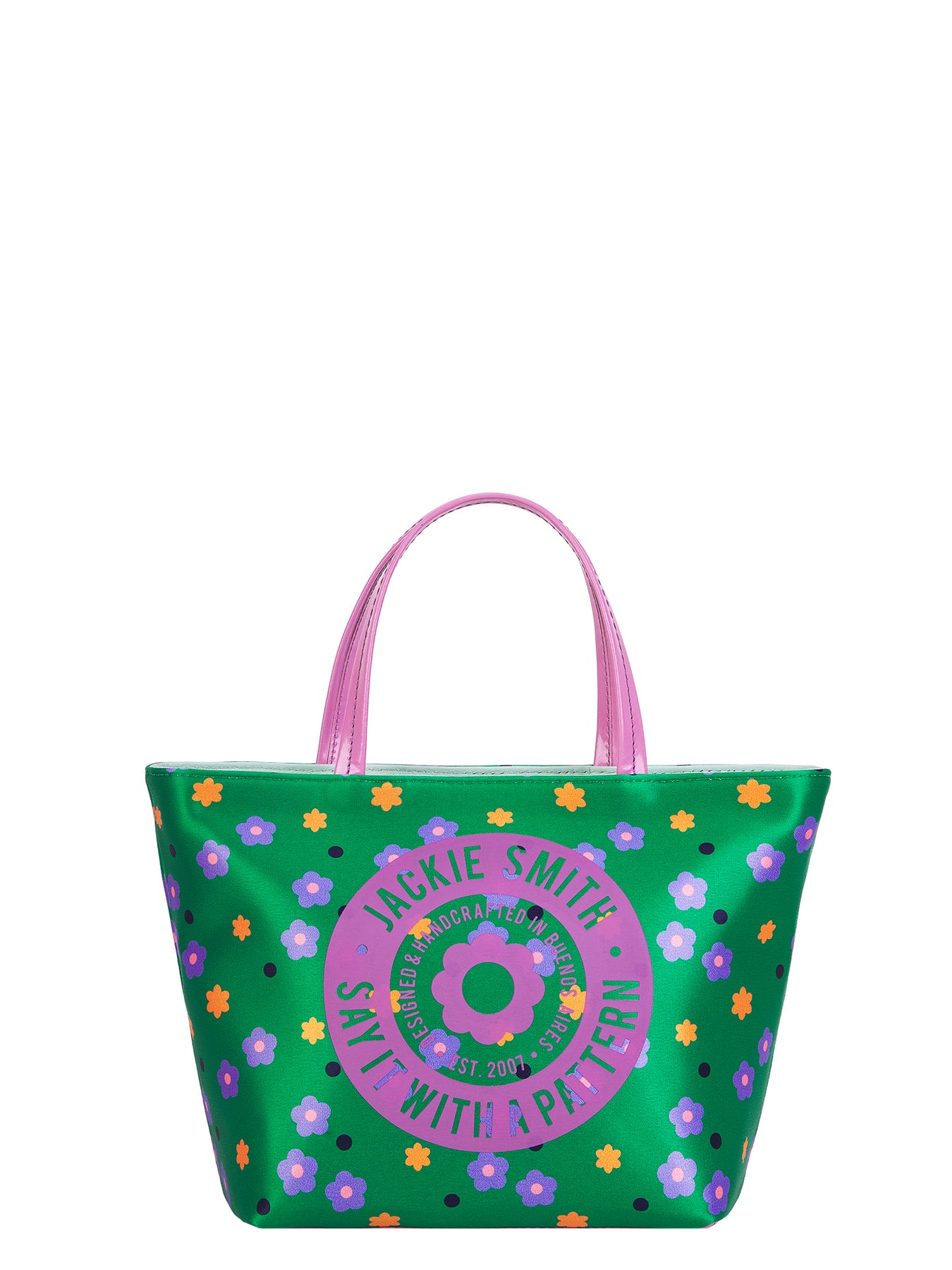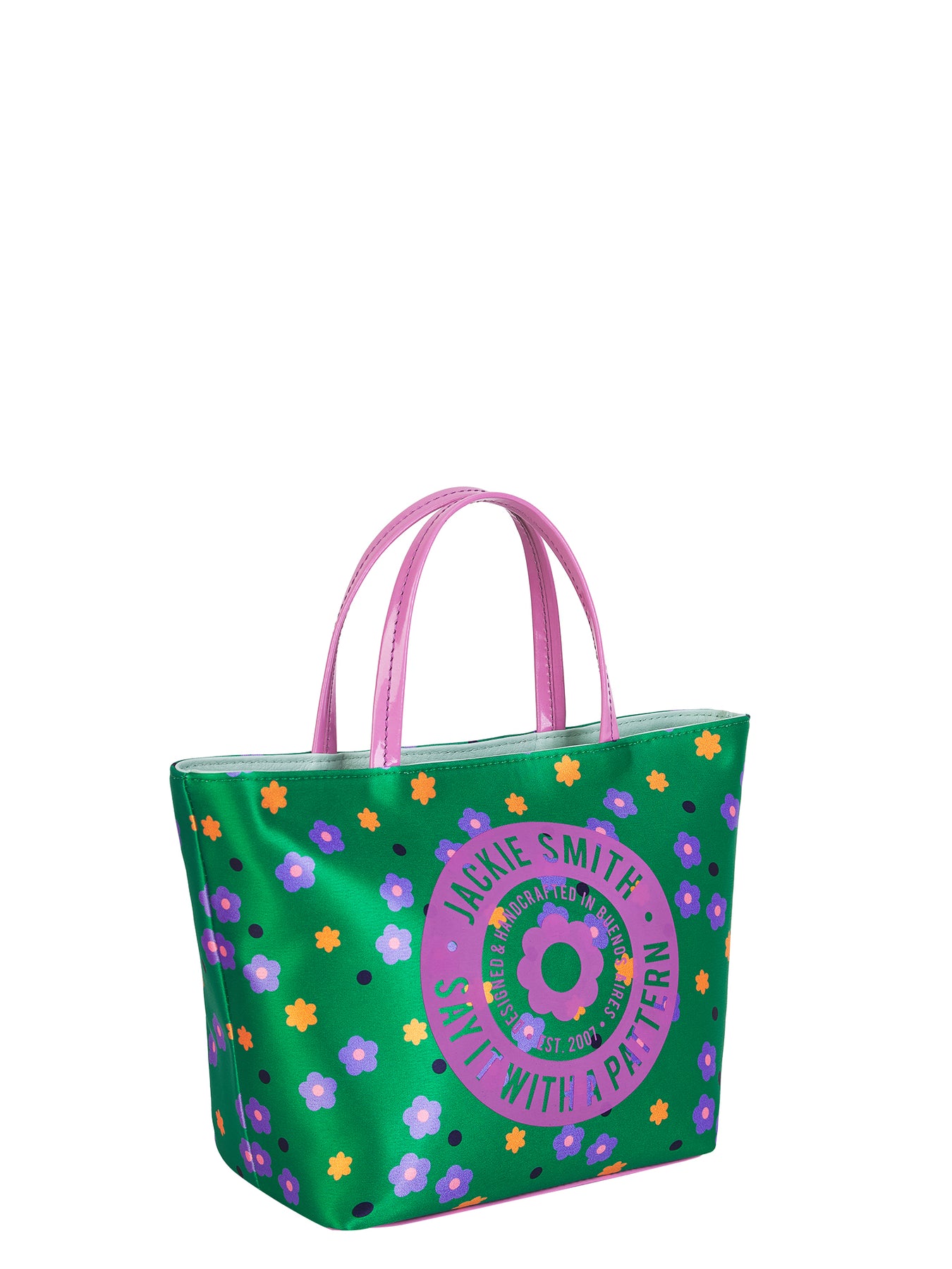 Confeccionada en raso custom print, con acentos en charol y cuero graneado natural, este mini shopping bag combina oficio y fantasía en igual medida. Su estampa floral —vibrante, gráfica y optimista— imprime el espíritu lúdico de Jackie en una pieza versátil y expresiva. Su interior forrado en gabardina revela una organización funcional y serena, con bolsillo multifunción que resguarda con elegancia lo esencial. Sus herrajes bañados en níquel aportan definición y un destello discreto que realza la textura de sus materiales. Una celebración del color, la frescura y la belleza de lo simple.