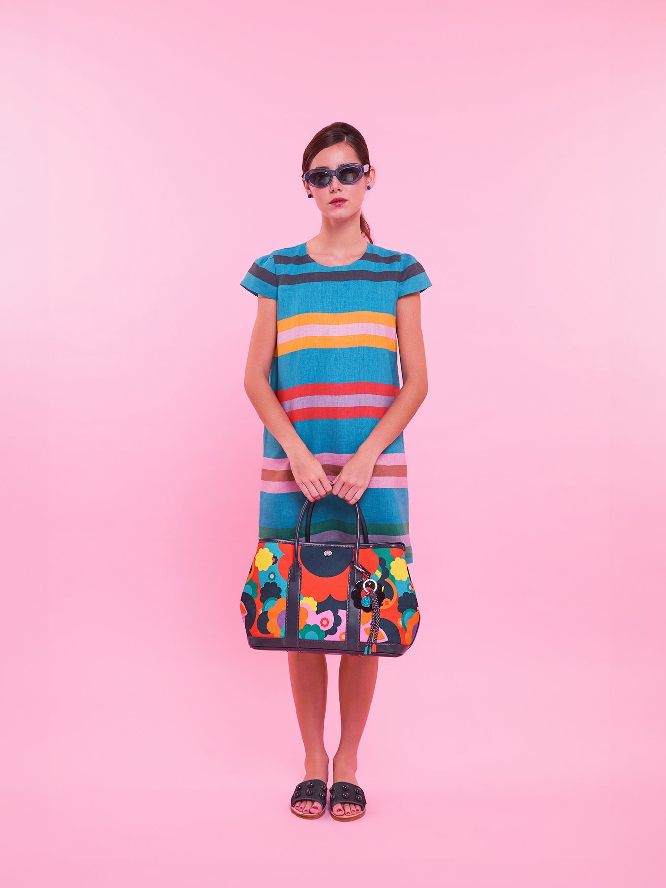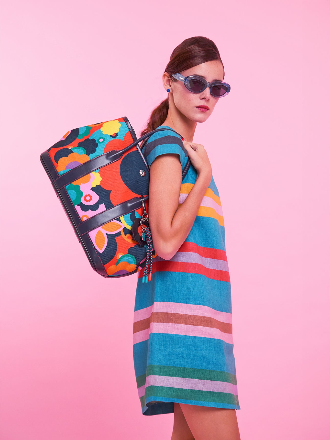 Grace evoca los días pausados, el murmullo del mar y la promesa suspendida de las tardes sin prisa. Confeccionada en canvas de algodón, su composición de flores abstractas y contrastes vibrantes traduce la energía estival en un gesto gráfico y sofisticado. Acentos en PU vaqueta contribuyen a acentuar el espíritu resort que la envuelve: color, frescura y un toque de sofisticación relajada. Sus herrajes bañados en níquel aportan estructura y brillo sutil, mientras el interior en canvas revela una organización práctica y precisa. El llavero removible, con charm en forma de flor y detalles esmaltados, actúa como un guiño alegre —una pequeña celebración del verano, de su luz, y de esa sensación de belleza que parece durar para siempre.