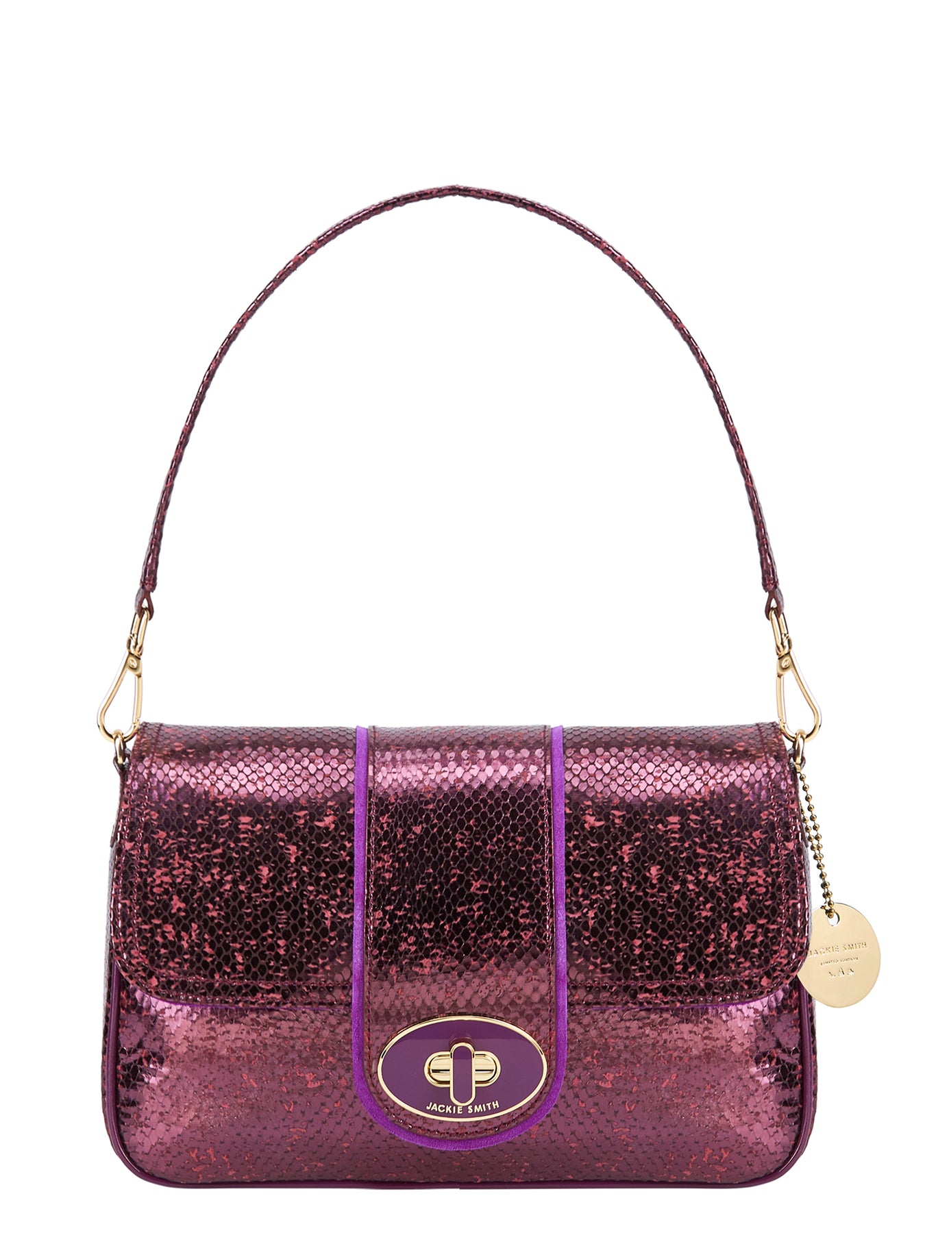 En esta temporada, su superficie en cuero metalizado grabado con efecto pitón despliega una luminosidad intensa y sofisticada, que transforma cada plano en un juego de reflejos profundos. El acabado, vibrante y texturado, potencia el color y le otorga una dimensión casi escénica, mientras que los vivos y detalles en contraste subrayan su arquitectura con un gesto gráfico preciso.