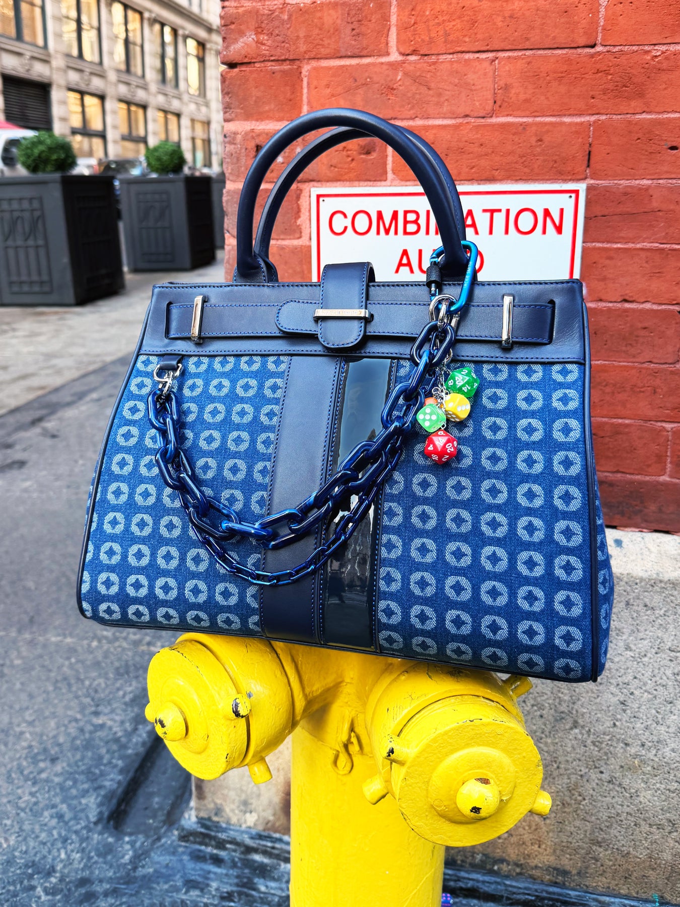 Un diseño estructurado y vibrante que juega entre la tradición y el guiño inesperado. Este satchel en jacquard azul con nuestro signature Monogram despliega un aire gráfico y sofisticado, realzado por detalles en un delicado cuero napa y herrajes niquelados que refuerzan su impronta arquitectónica. Las cadenas, una en resina y la otra en aluminio metalizado, en azules intensos introducen una nota contemporánea, mientras que el charm con dados de colores aparece como un gesto lúdico, casi secreto, capaz de transformar esta pieza en un objeto narrativo, donde la elegancia convive con la fantasía.