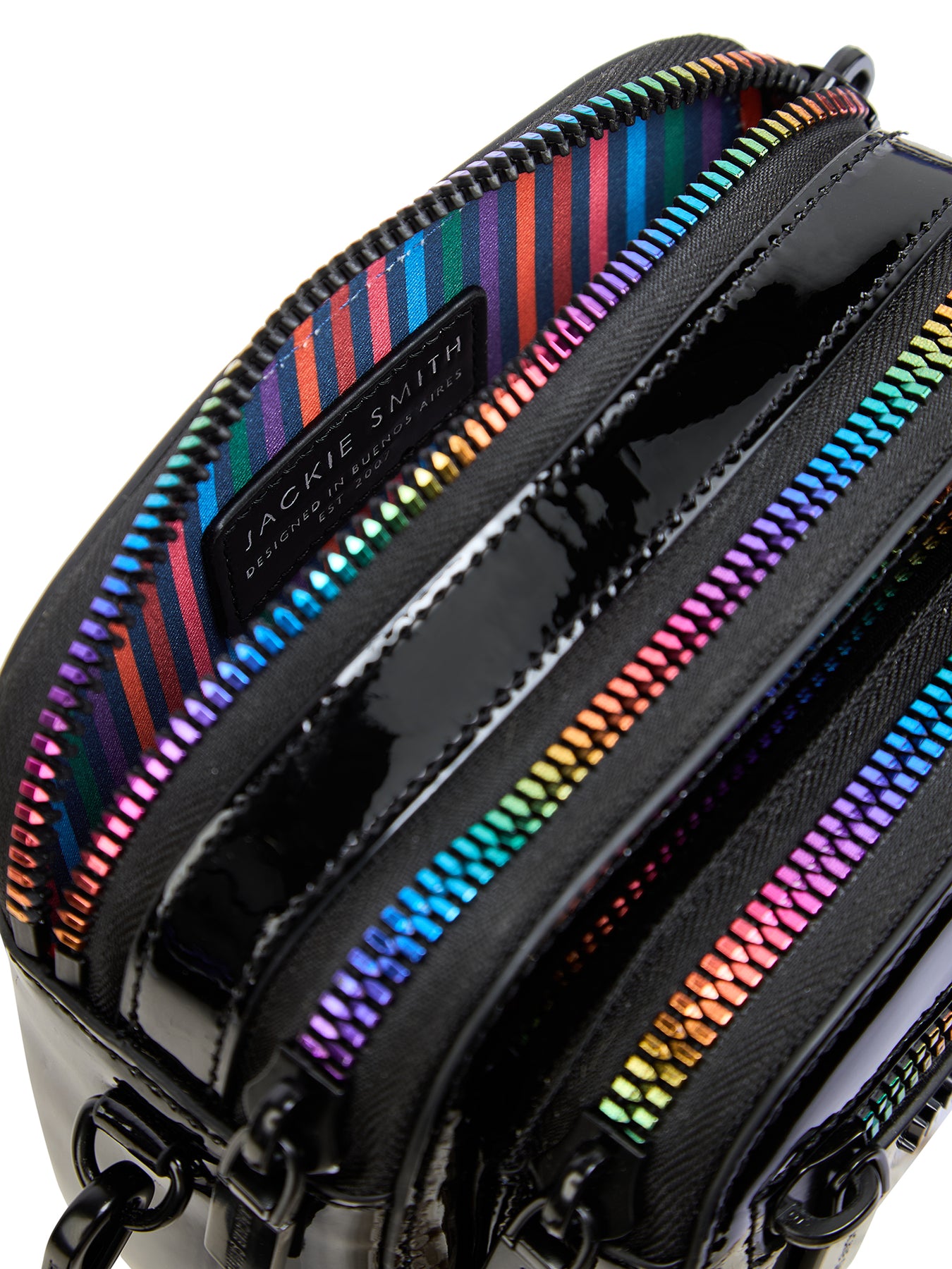 Supernova celebra el espíritu festivo con una elegancia contemporánea. Confeccionada en cuero efecto espejo, este crossbody presenta dos compartimentos independientes y un bolsillo frontal con doble acceso, diseñados para acompañarte con precisión en cada salida. Su manija regulable y removible en ribbon custom print te permite llevarla al hombro, cruzada o en la mano, adaptándose con naturalidad al ritmo de una noche inolvidable.