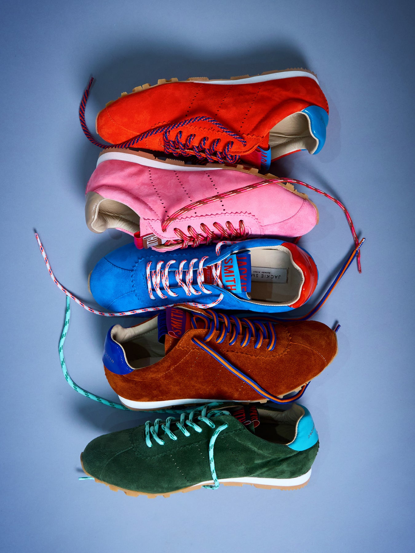 Confeccionadas en suave gamuza italiana, su textura mate equilibra la intensidad del color, mientras que los cordones en contraste introducen un gesto gráfico inesperado, y lúdico. Su suela liviana acompaña el movimiento con naturalidad, haciendo que cada paso se sienta ágil, flexible y despreocupado.