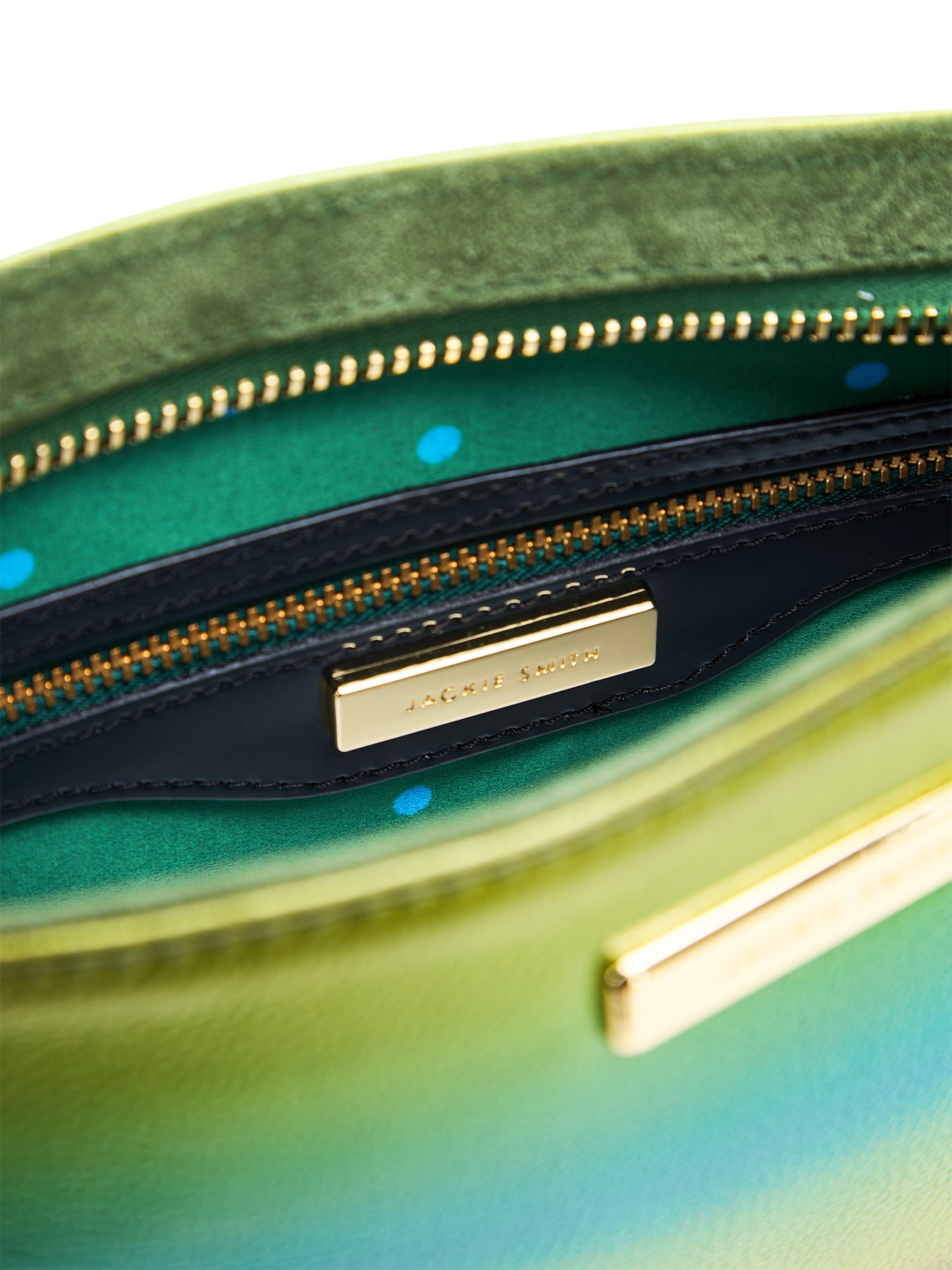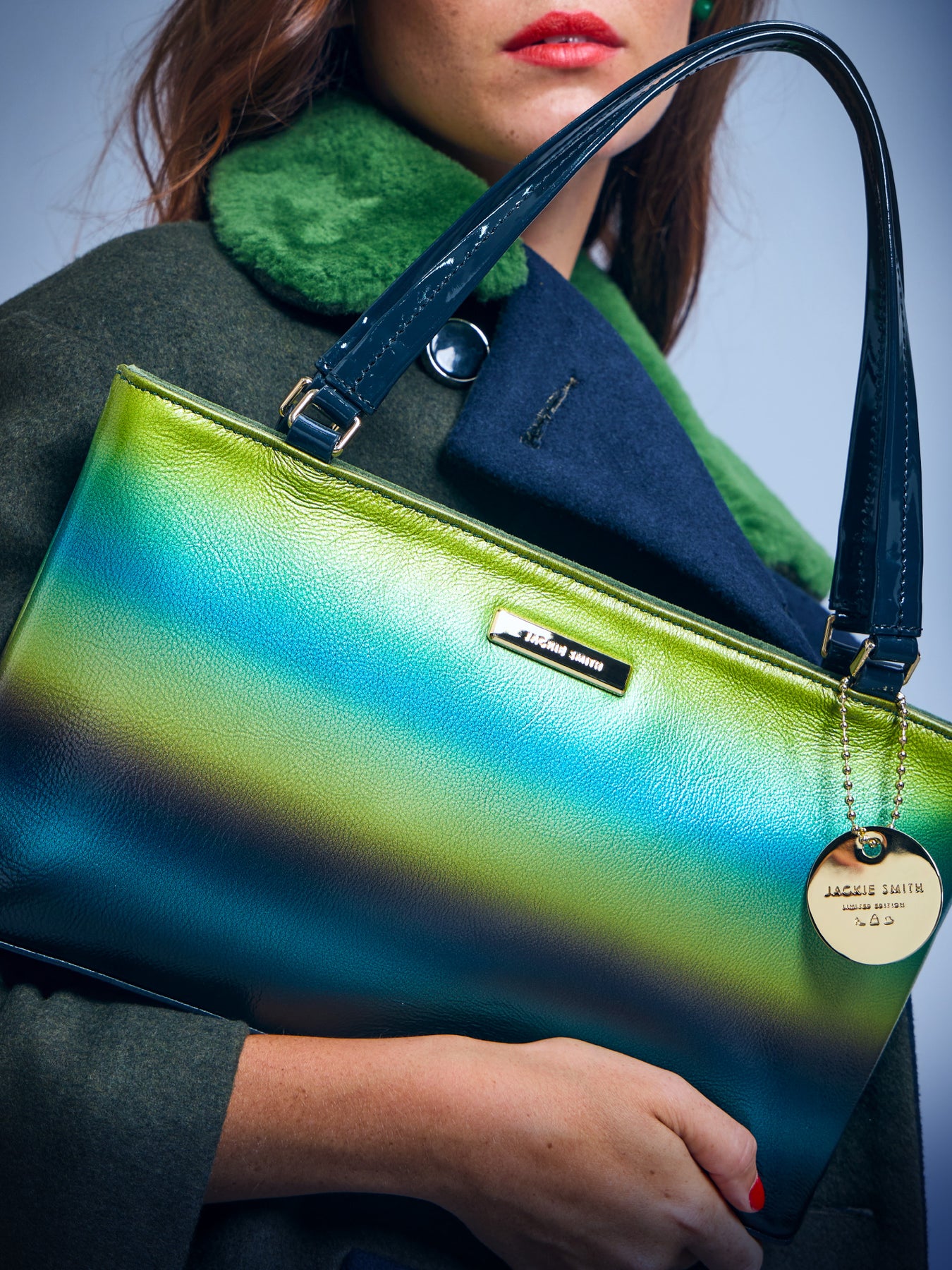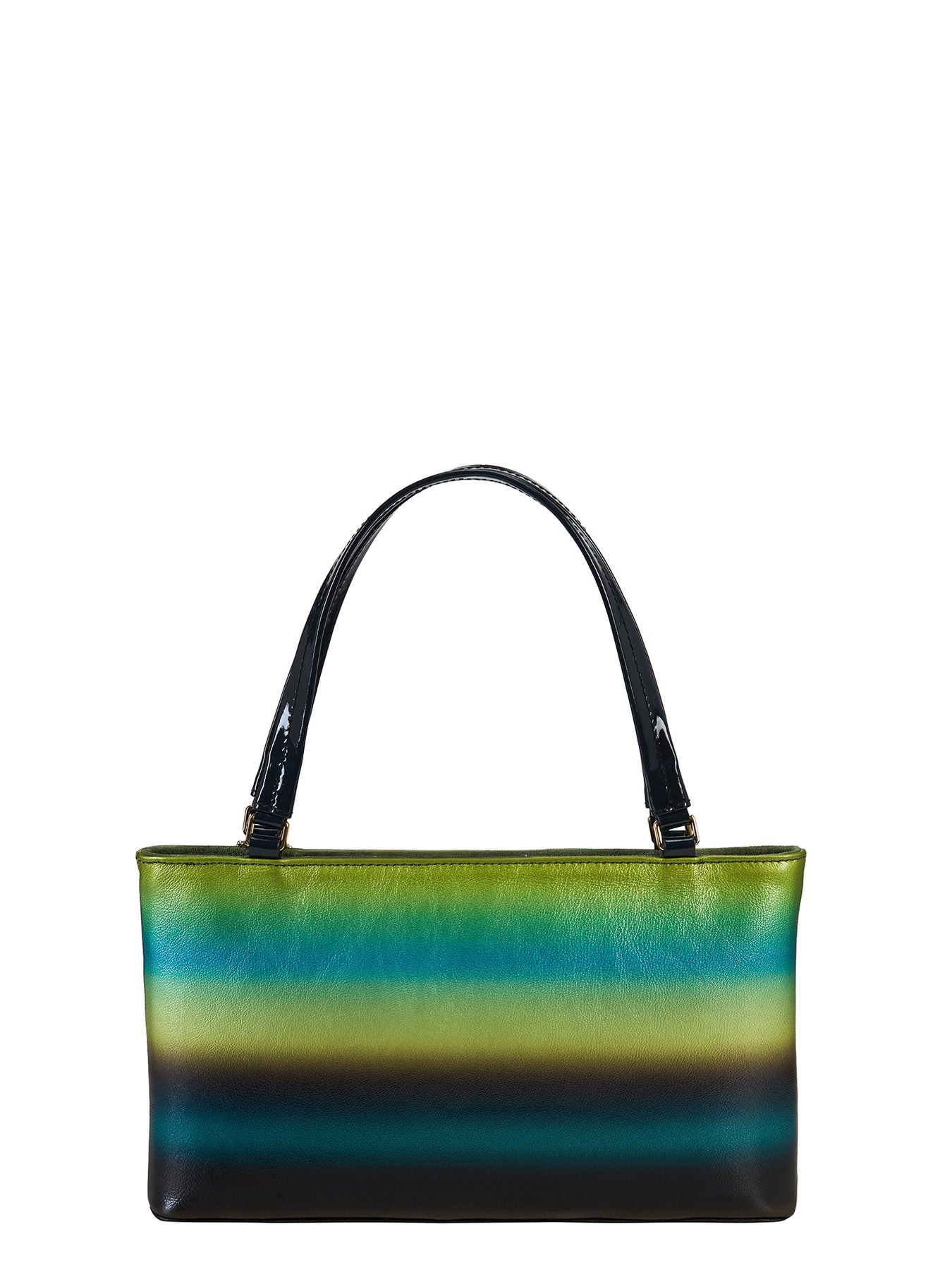Su exclusivo cuero italiano despliega un degradé luminoso que parece disolver los límites entre color y luz: una transición sutil que evoca el instante en que el paisaje cambia de tono y todo adquiere una profundidad inesperada. La superficie, vibrante, casi etérea, responde al movimiento con reflejos que transforman su intensidad a cada paso, revelando una dimensión sensorial que la vuelve tan visual como táctil.
