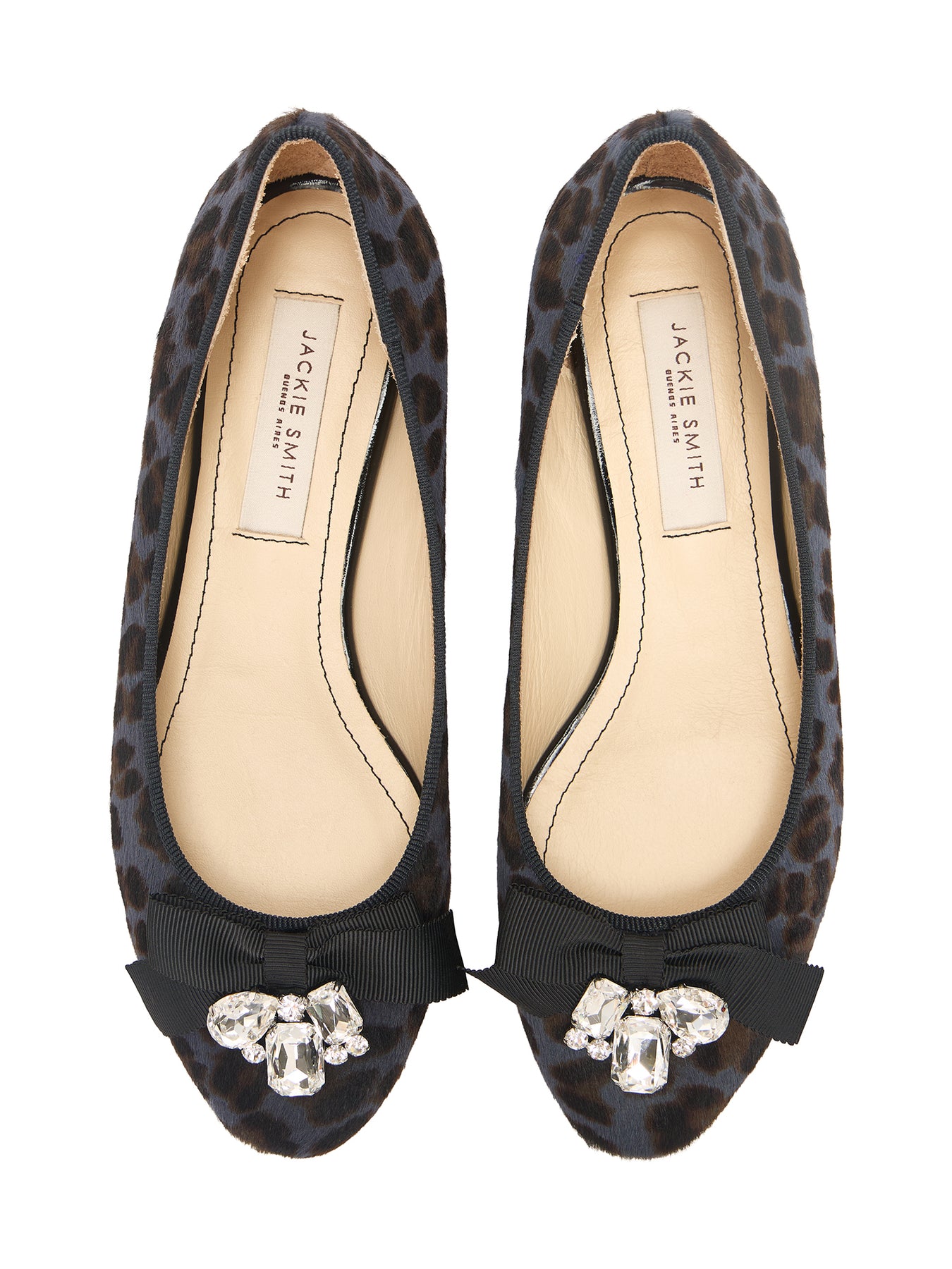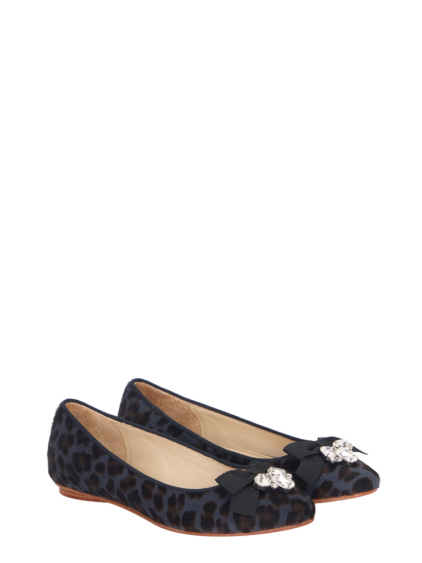 Estas ballerinas confeccionadas en pelo de becerro con estampa animal print y embellecidas con un precioso aplique que combina un moño con piedras de edición limitada, son un clásico que usarás durante años. Su silueta simple y el escote perfecto contribuyen a lograr un look femenino y relajado.