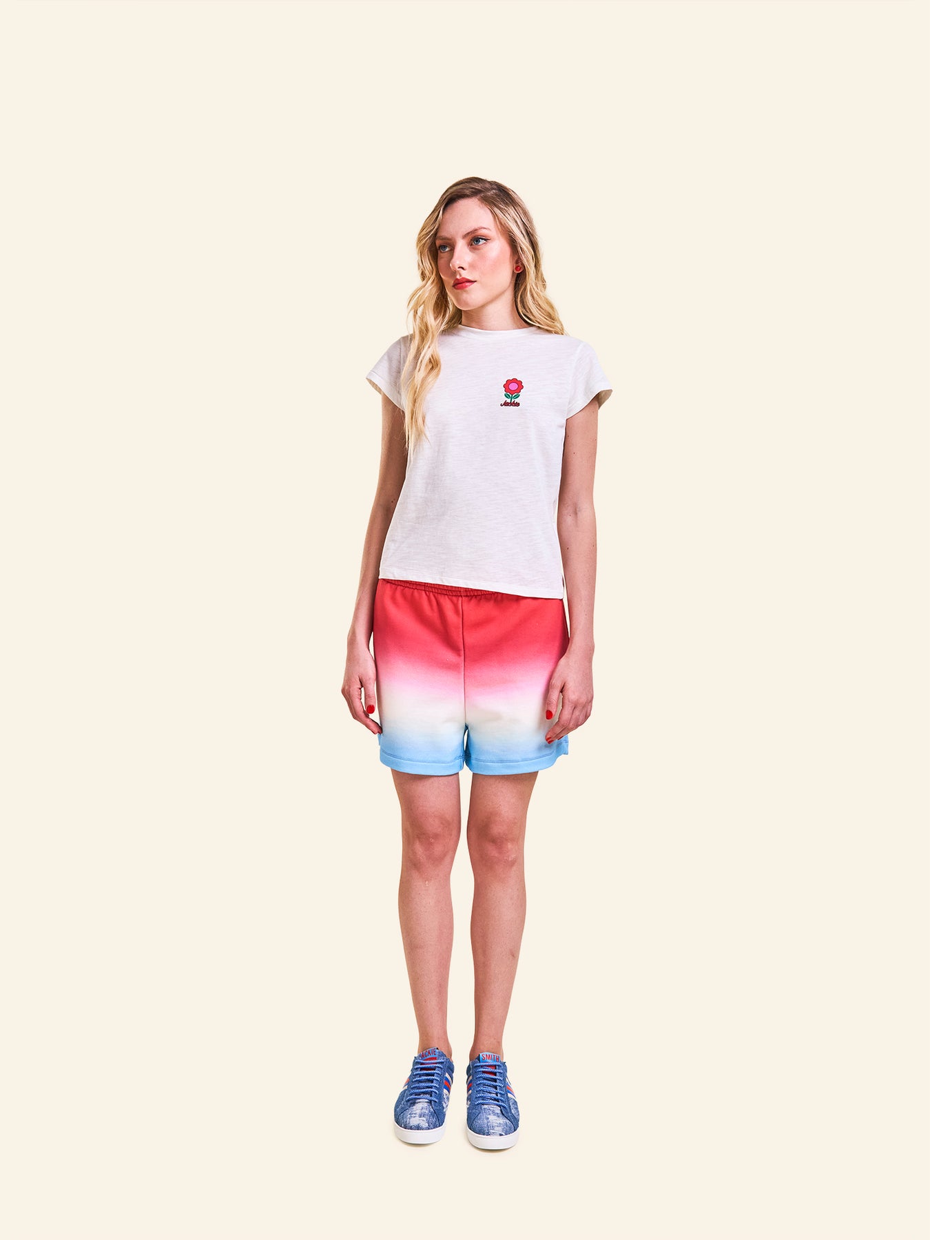 A study in color and ease. These shorts dissolve boundaries between day and dusk, their gradients flowing like painted skies. The cotton drapes with quiet softness, while the silhouette embraces ease as a form of elegance. More than leisure, they carry the suggestion of a horizon always just beyond reach—vivid, shifting, and infinite.