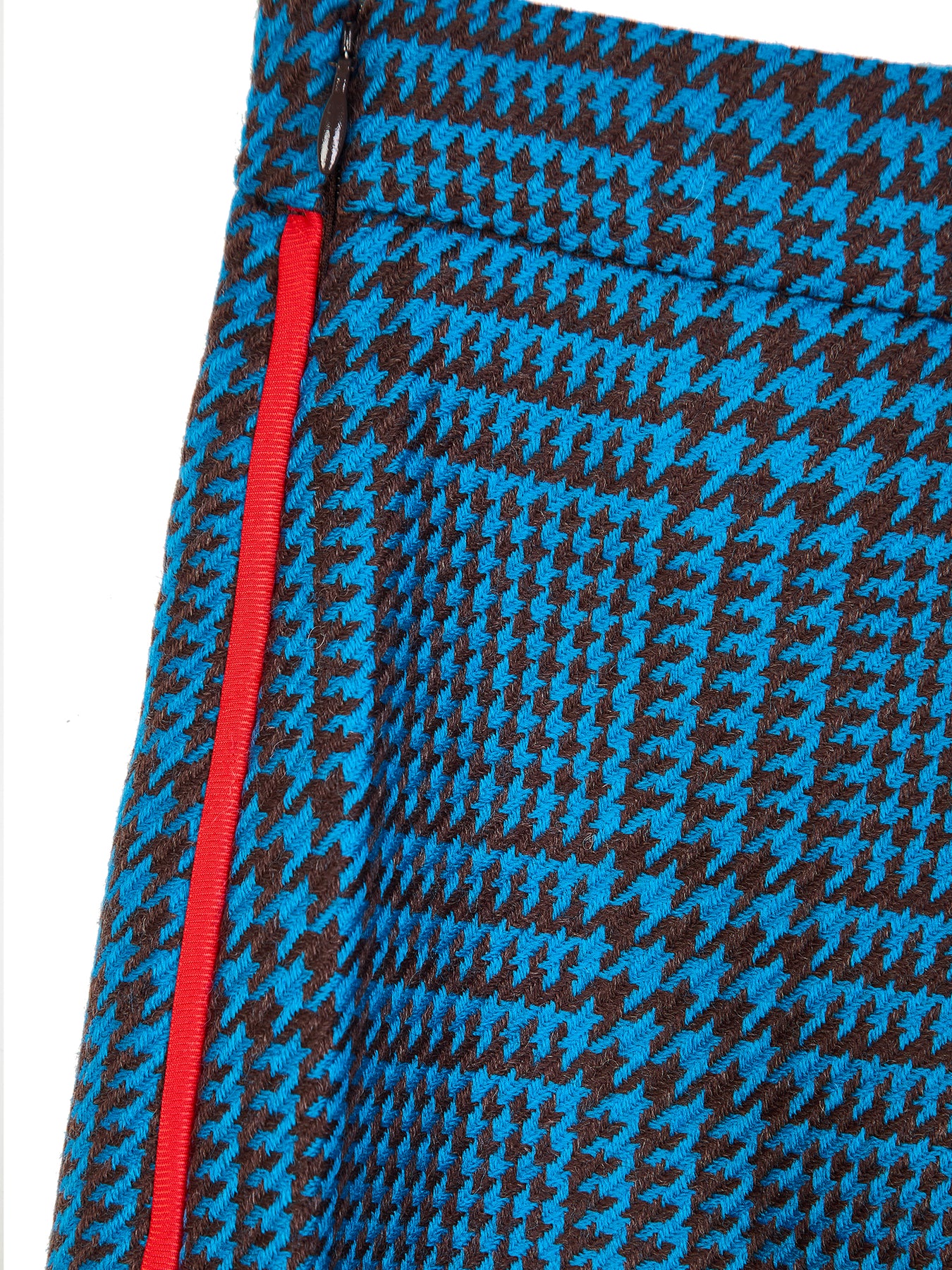 Rooted in the heritage of British tartan, this jacket reimagines tradition with a charge of unexpected energy. Rendered in a vivid turquoise, it’s crafted from pure Italian wool and juxtaposes a classic check with coral piping that traces the collar and placket like a precise, almost illustrated line across the surface. Its tailored silhouette contours the body with definition while retaining a sense of ease. Flap-front pockets lend a subtle utilitarian inflection, and the satin lining ensures comfort and structure in equal measure. That tension between heritage and pop-inflected detail is what makes it compelling—polished, luminous, and imbued with just enough character to elevate the simplest look into something quietly unforgettable.