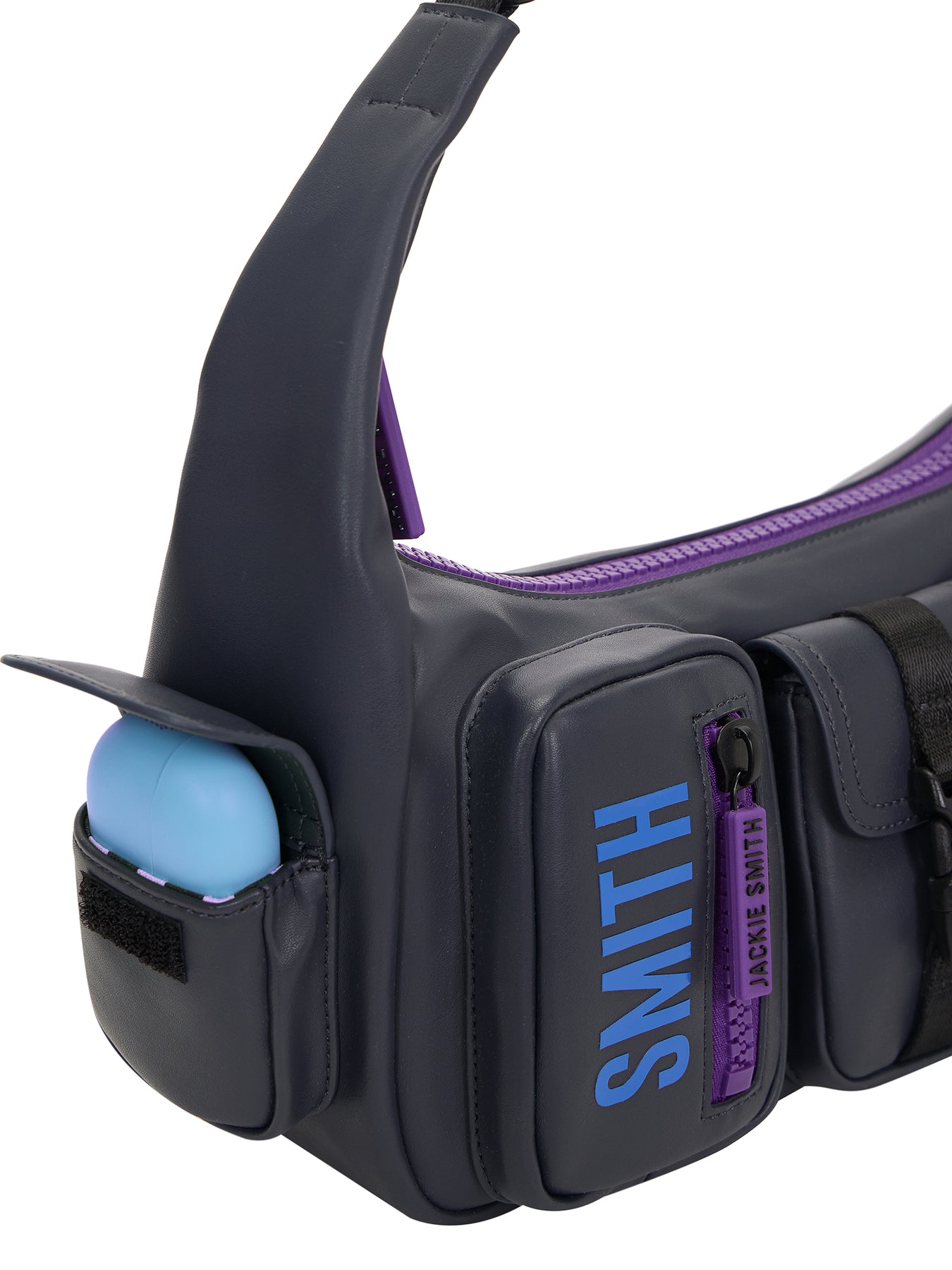 - central front pocket with woven ribbon and black plastic buckle