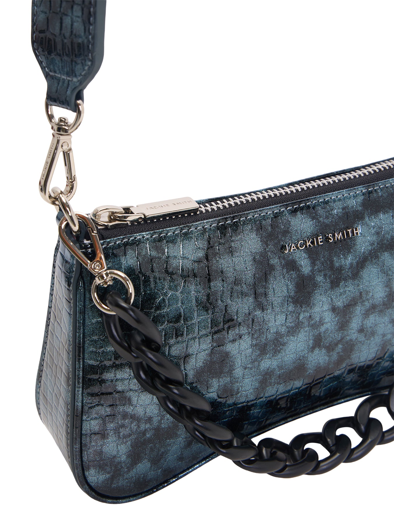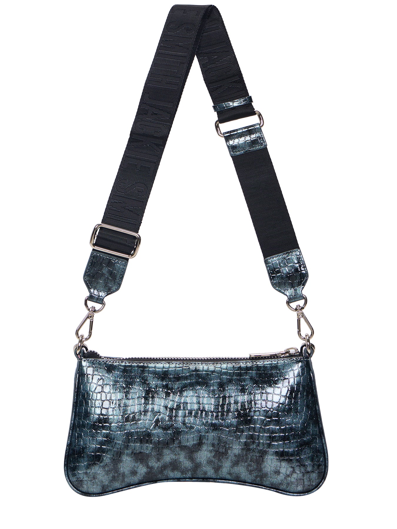 A maxi baguette crafted in croc-embossed PU with a high-shine finish that catches the light with unapologetic intensity. Its compact silhouette is sharpened by a bold attitude: a wide, logo-jacquard strap—adjustable and removable—grounds it in the present, while the sculptural chain introduces a graphic contrast that feels deliberate and directional.
