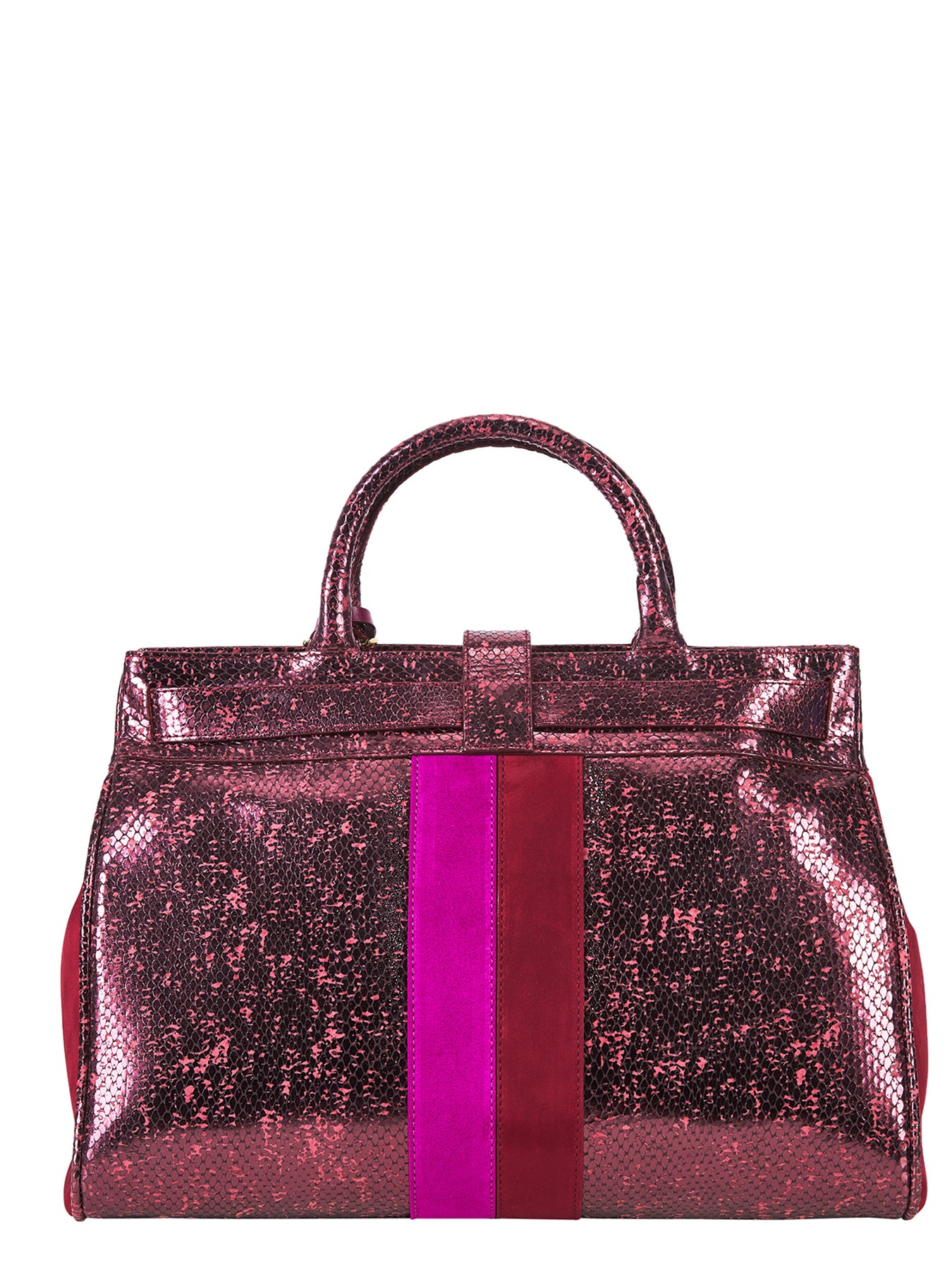 An architectural satchel with a timeless presence, part of a limited edition crafted in Buenos Aires from Italian materials chosen for their exceptional beauty. Its metallic, python-embossed leather radiates a striking luminosity, intensifying the depth of color and transforming each facet into a shifting play of light. Our signature suede stripes cut across the front with graphic precision, introducing rhythm and a contemporary charge to the bag’s classic structure.