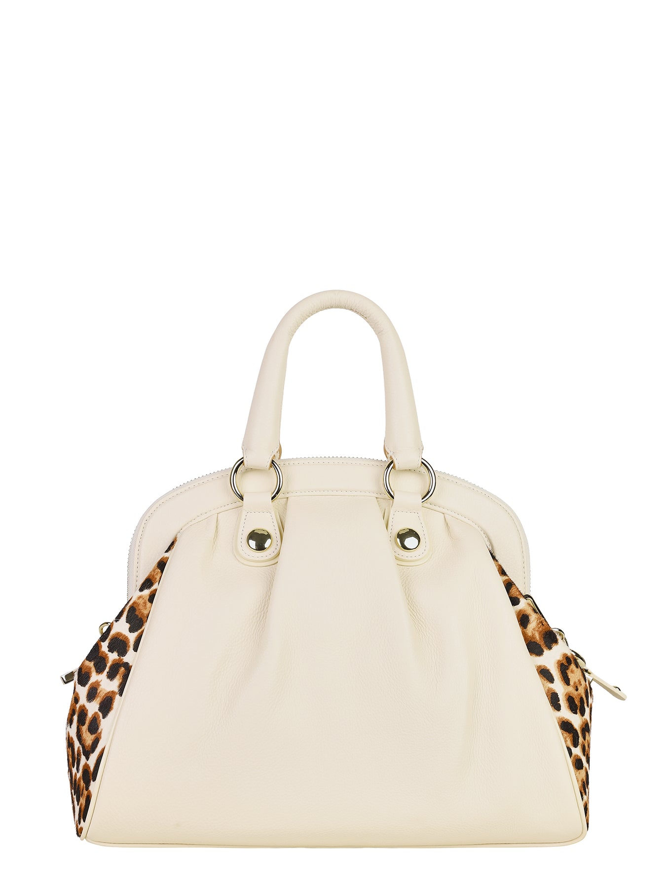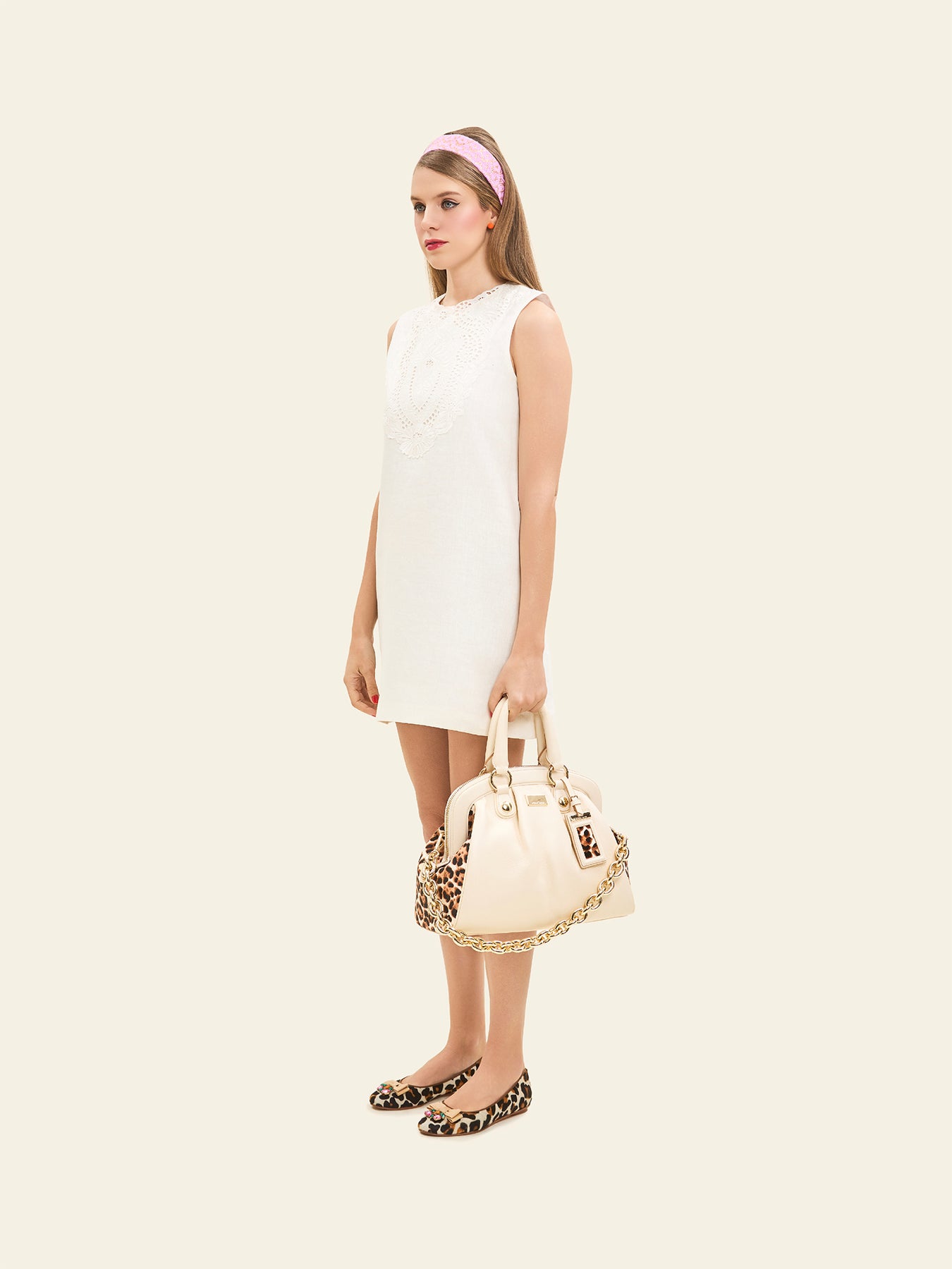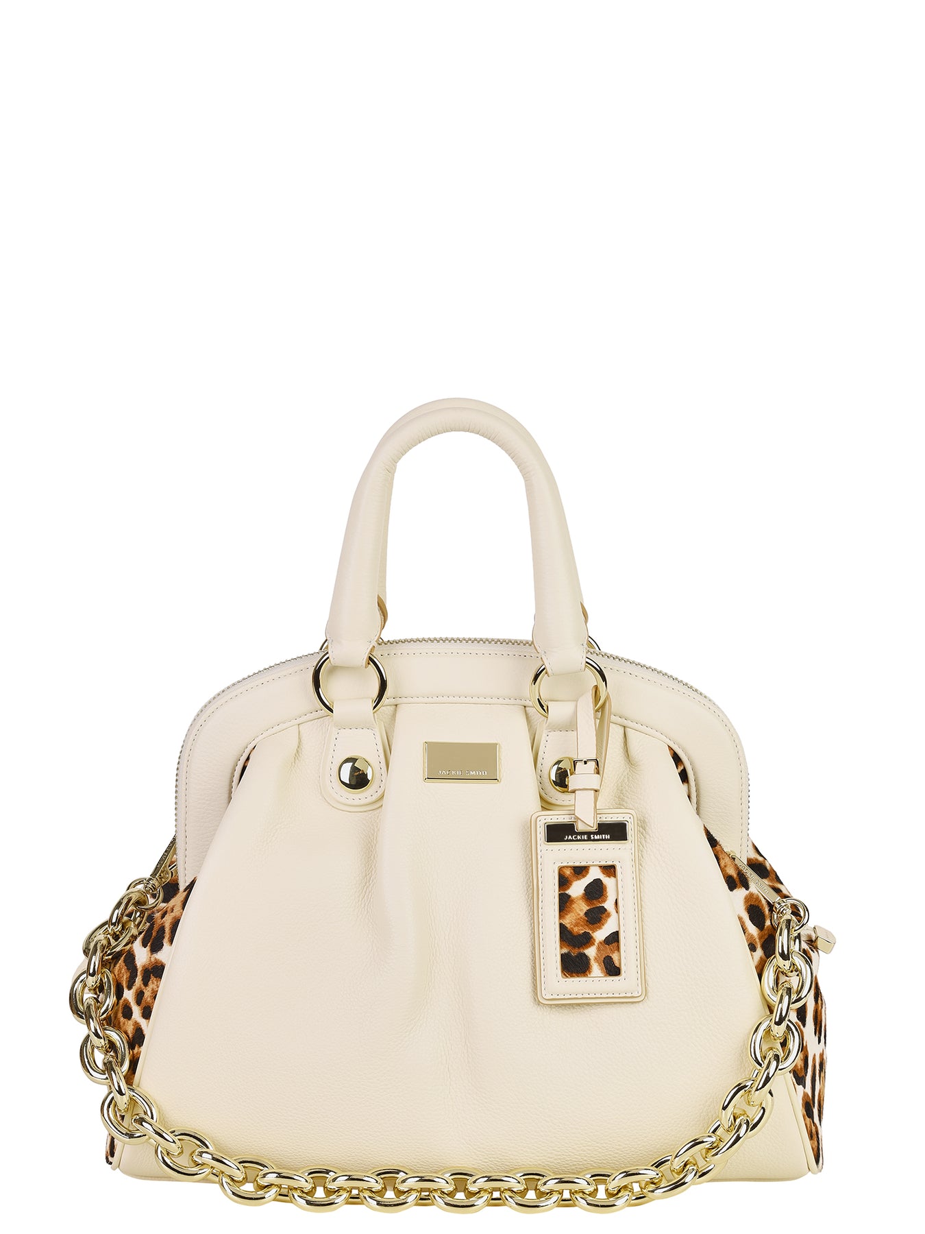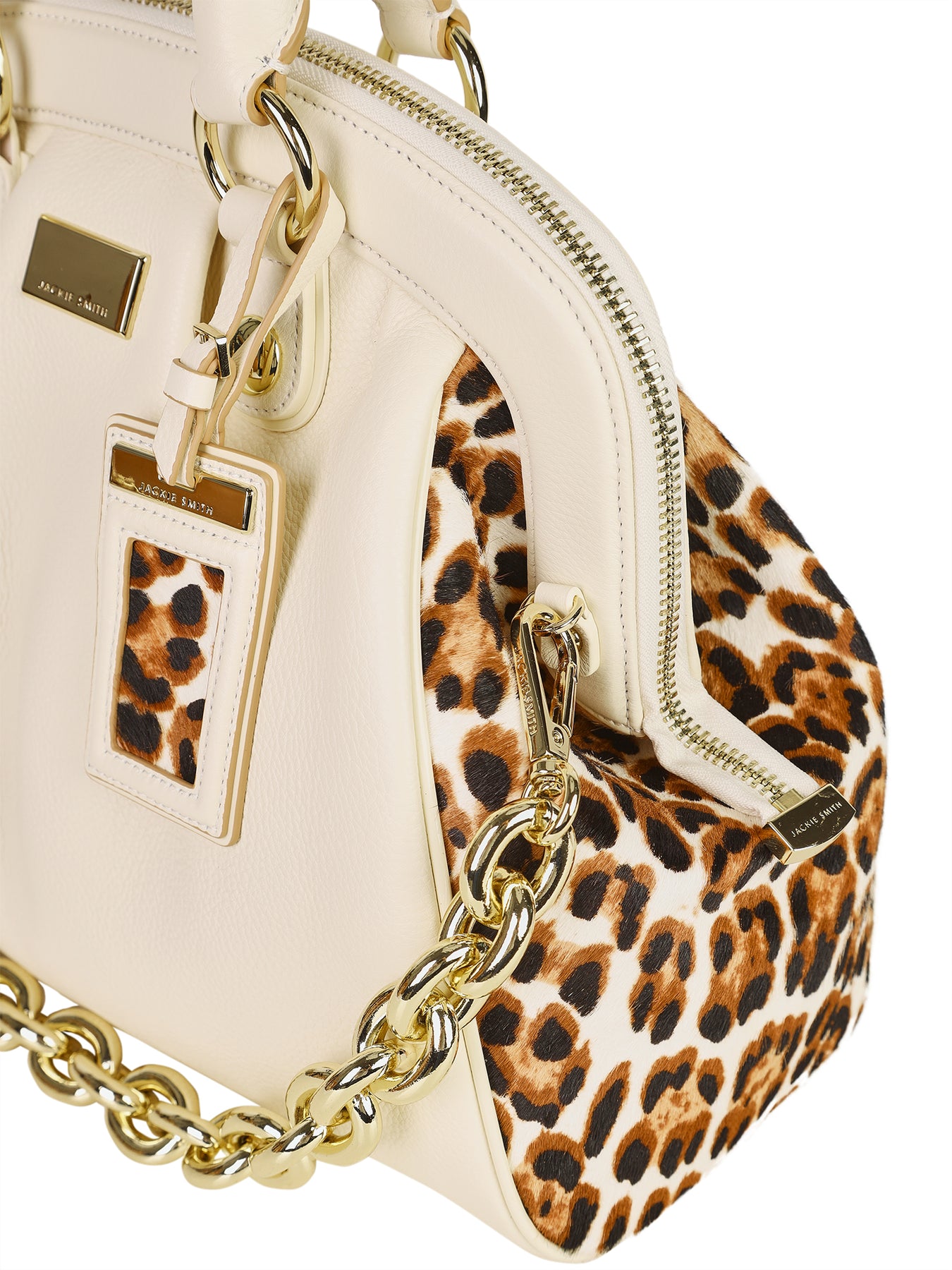 Un bolso que se despliega como un juego de contrastes refinados. El cuero graneado natural se luce en un impactante contrapunto con los fuelles en pelo animal print, los cuales irrumpen como un susurro elegante, cargado de energía atemporal. La cadena dorada, conformada por maxi eslabones, aporta el brillo de una joya y es acompañada por precisos herrajes que subrayan su magnetismo. El ID tag con acento gráfico sella su identidad, mientras en el interior la amplitud se combina con infinitas posibilidades de organización. Una creación concebida para habitar la rutina con elegancia serena y un espíritu lúdico que convierte lo cotidiano en extraordinario.