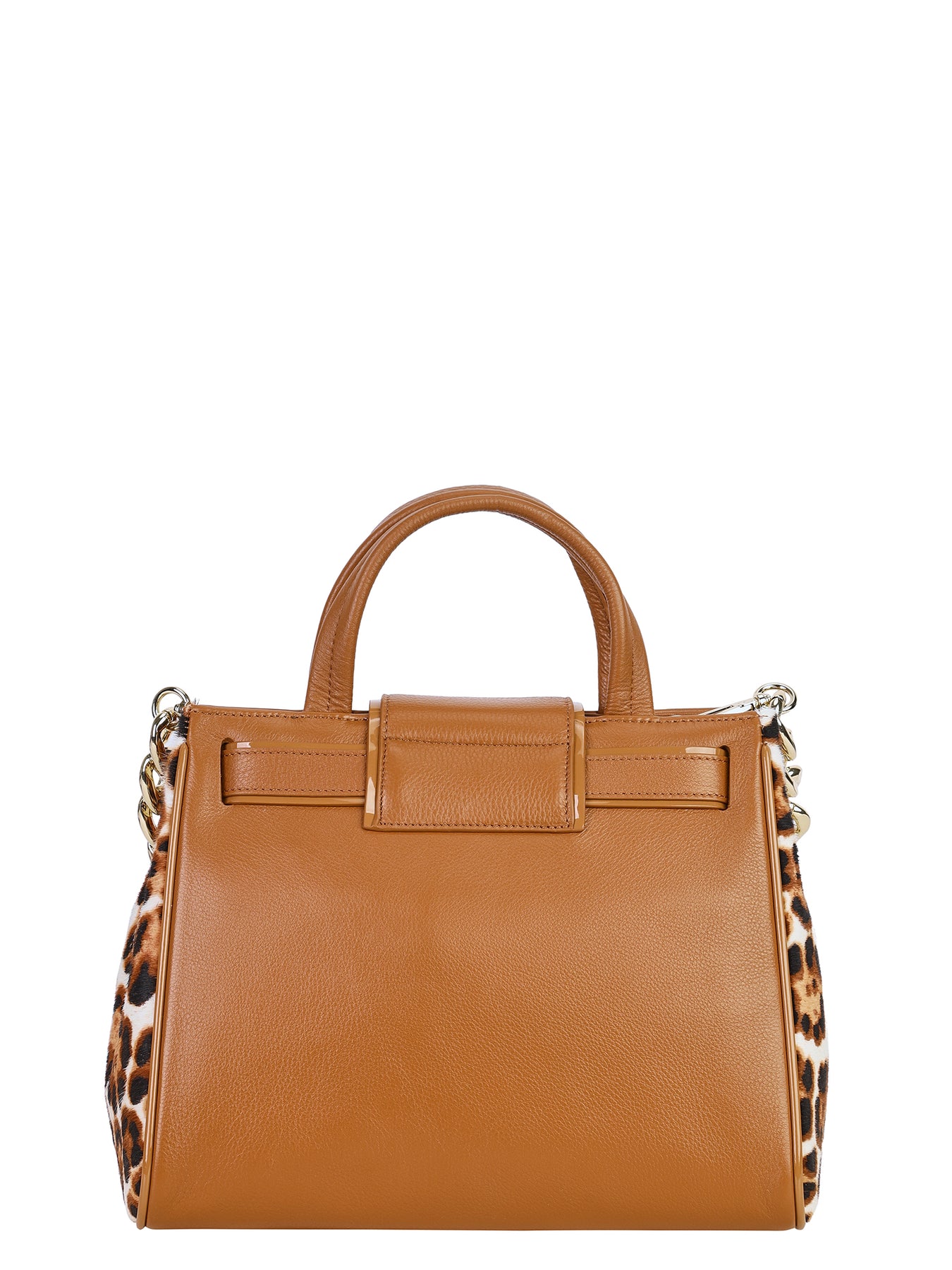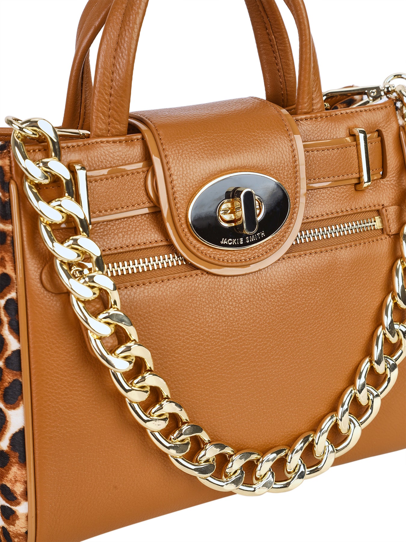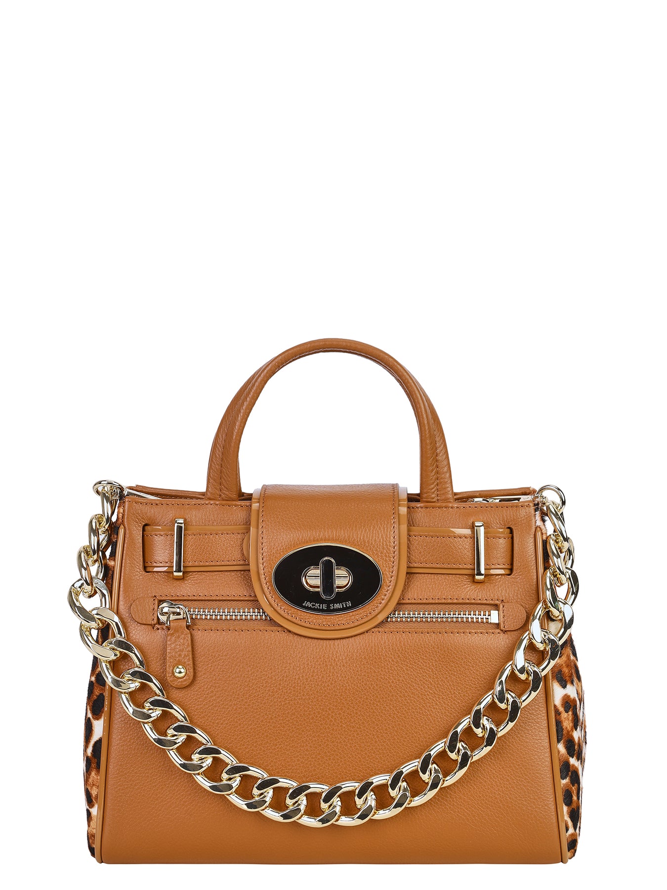 Una pieza donde conviven fuerza y refinamiento. El cuero graneado natural se convierte en lienzo para un juego inesperado: fuelles en animal print que irrumpen como una exclamación elegante, dotando a esta pieza de un contraste vibrante y atemporal. La cadena dorada, formada por maxi eslabones, aporta brillo al punto de casi convertirse en un detalle de joyería, mientras dialoga con un torniquete esmaltado que subraya su carácter distinguido. En el interior, amplitud y organización se despliegan. Un mini satchel que se mueve entre la elegancia urbana y el espíritu lúdico propios de Jackie.
