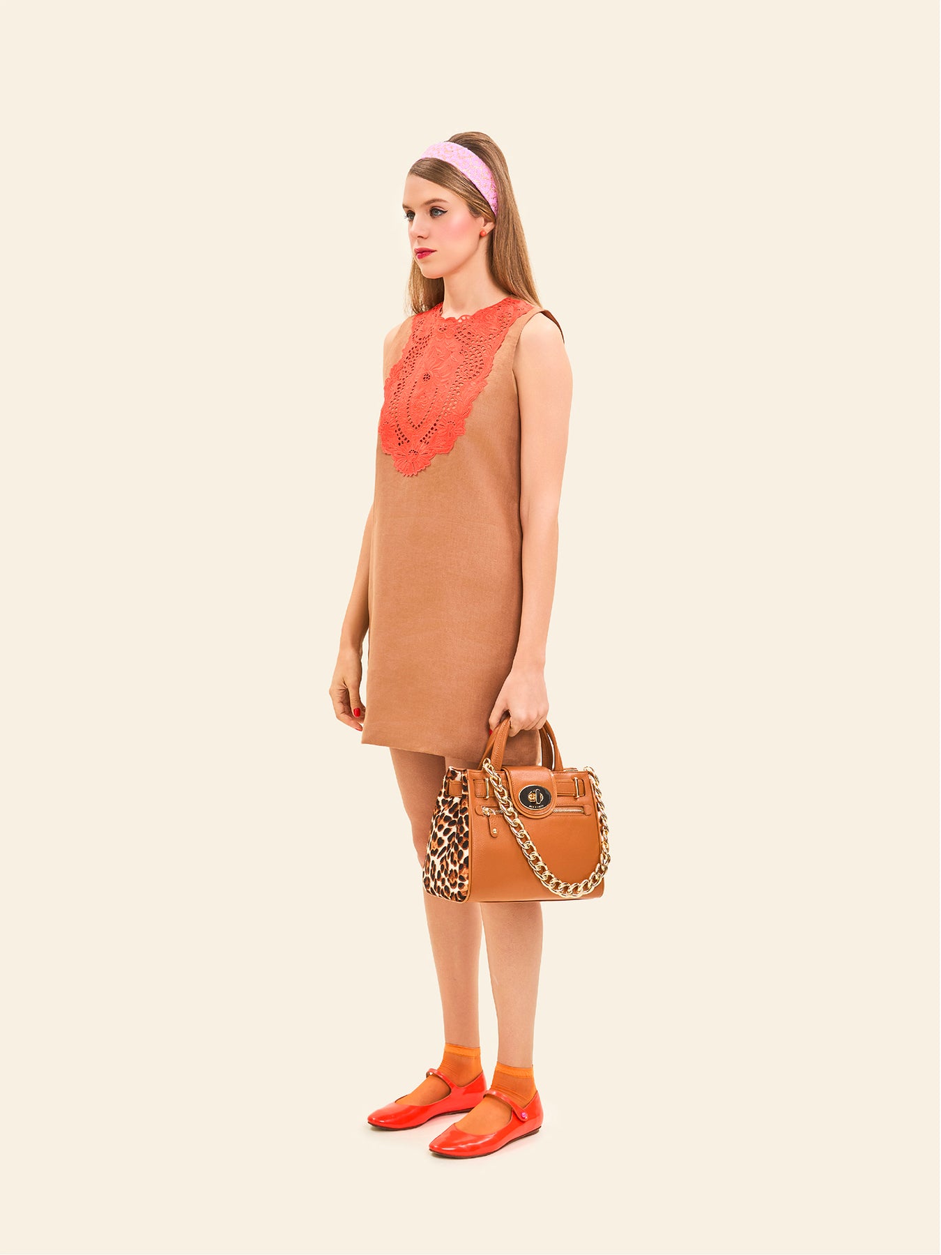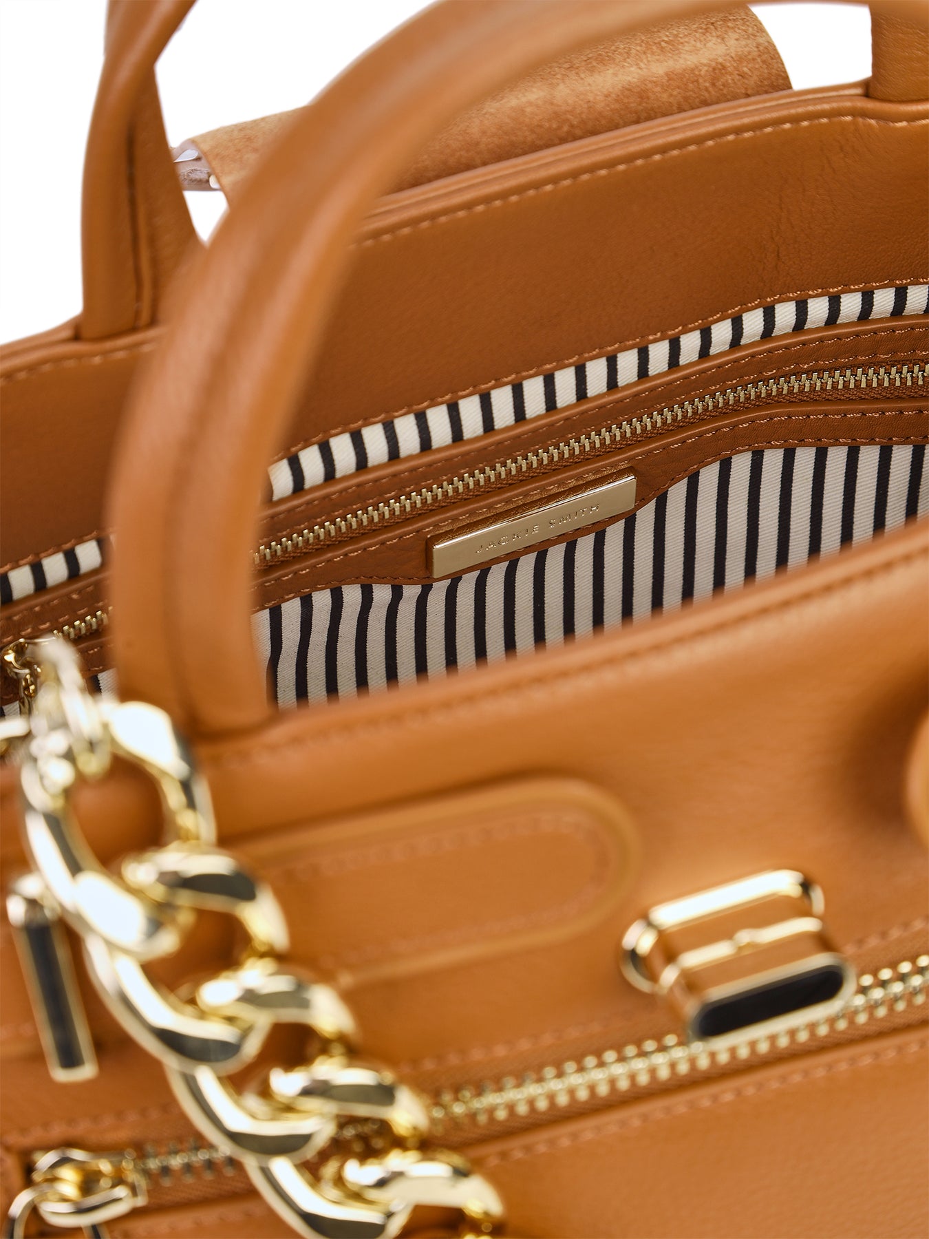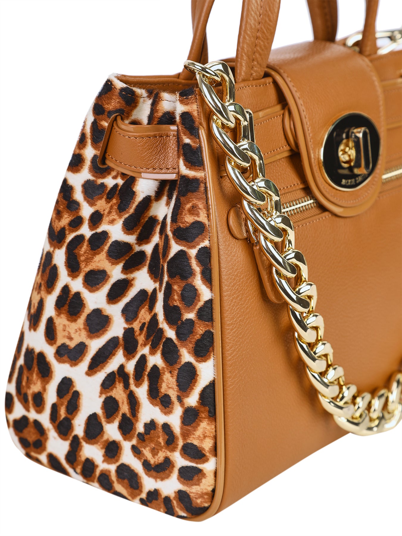 Una pieza donde conviven fuerza y refinamiento. El cuero graneado natural se convierte en lienzo para un juego inesperado: fuelles en animal print que irrumpen como una exclamación elegante, dotando a esta pieza de un contraste vibrante y atemporal. La cadena dorada, formada por maxi eslabones, aporta brillo al punto de casi convertirse en un detalle de joyería, mientras dialoga con un torniquete esmaltado que subraya su carácter distinguido. En el interior, amplitud y organización se despliegan. Un mini satchel que se mueve entre la elegancia urbana y el espíritu lúdico propios de Jackie.