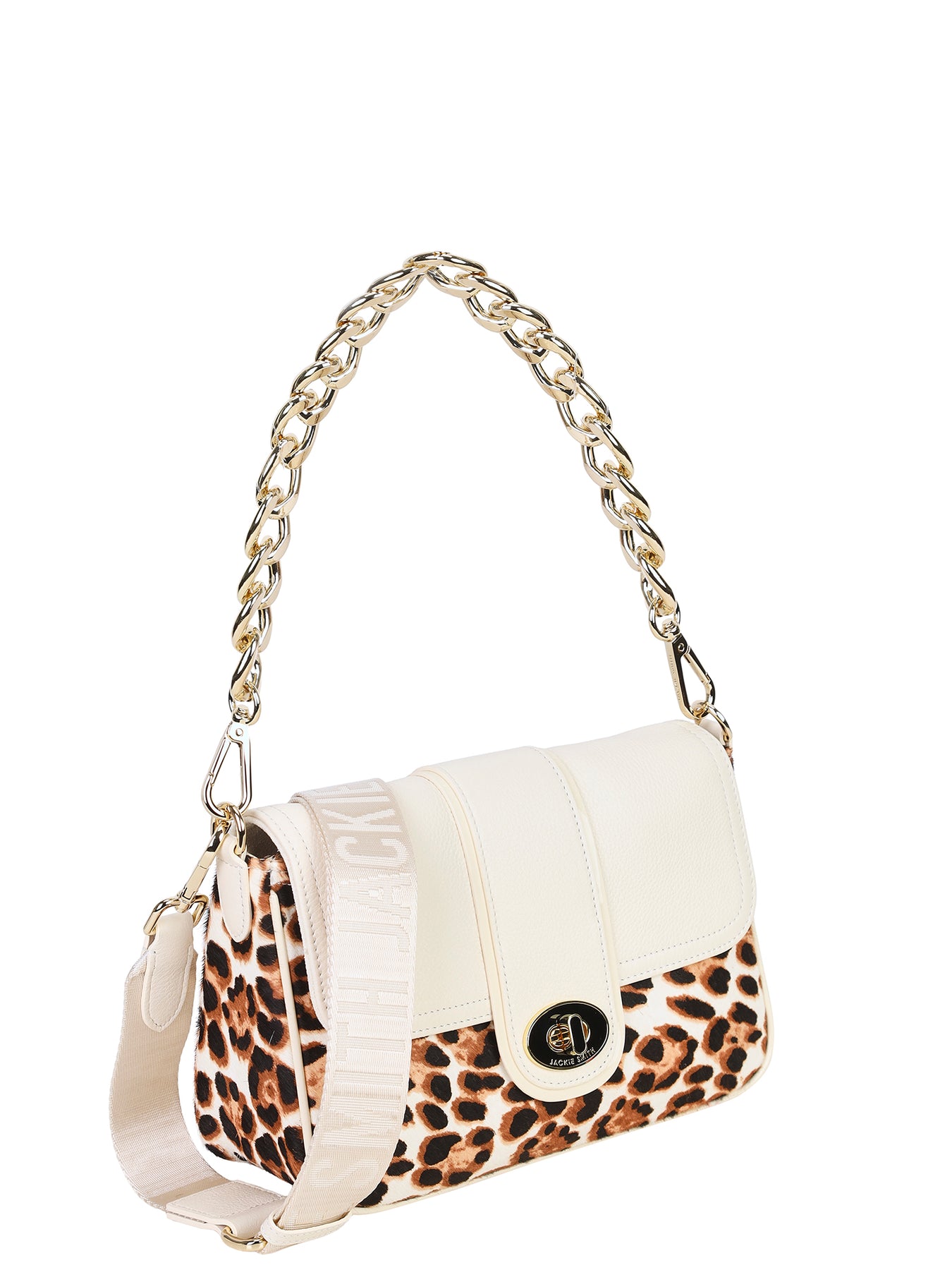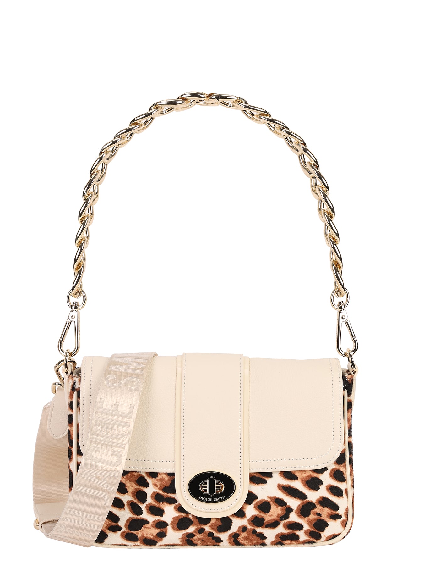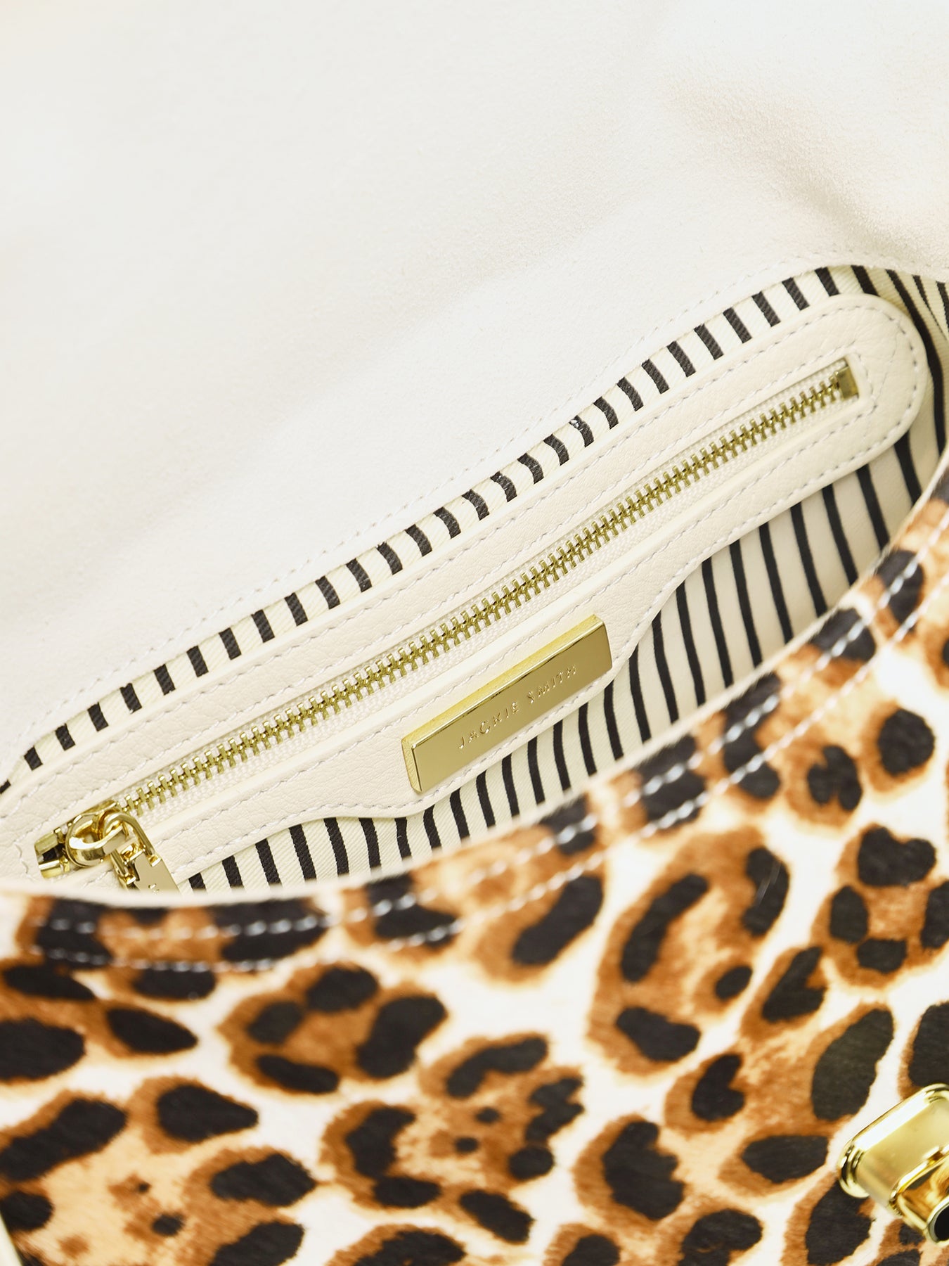 Una creación que combina audacia y sofisticación. El cuero graneado se encuentra con el pelo natural animal print, desplegando un juego de texturas que equilibra fuerza y refinamiento. La cadena con baño oro aporta un gesto escultórico, mientras que la strap regulable introduce un aire contemporáneo y versátil. Los herrajes metálicos y el cierre con torniquete esmaltado completan un diseño pensado para acompañar tanto la rutina urbana como las inolvidables salidas nocturnas, con un magnetismo que trasciende temporadas.