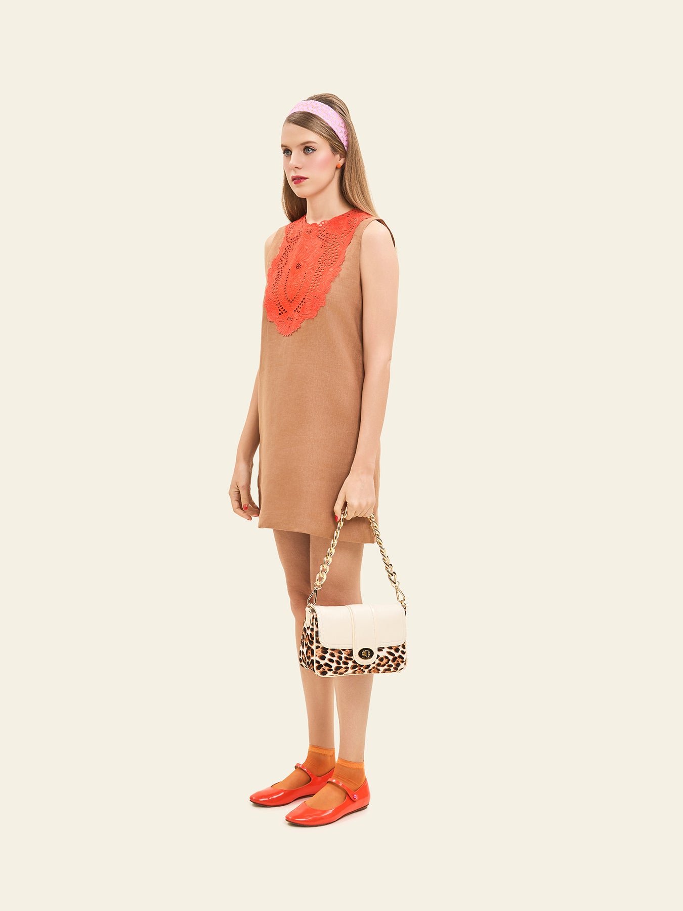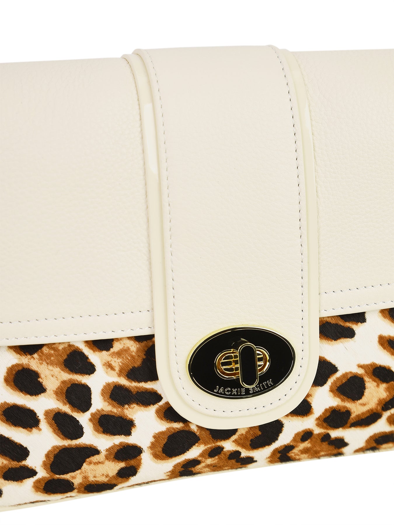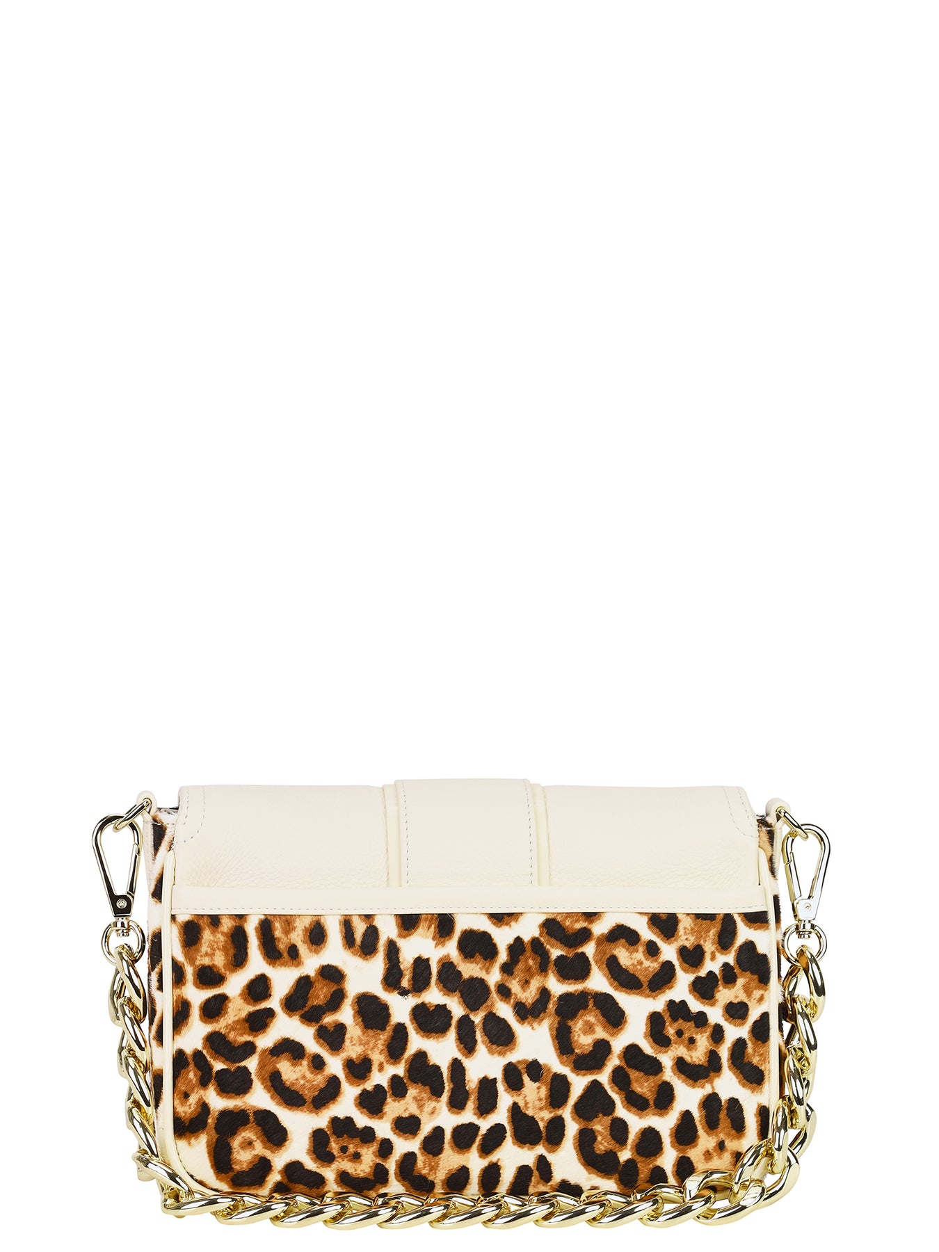Una creación que combina audacia y sofisticación. El cuero graneado se encuentra con el pelo natural animal print, desplegando un juego de texturas que equilibra fuerza y refinamiento. La cadena con baño oro aporta un gesto escultórico, mientras que la strap regulable introduce un aire contemporáneo y versátil. Los herrajes metálicos y el cierre con torniquete esmaltado completan un diseño pensado para acompañar tanto la rutina urbana como las inolvidables salidas nocturnas, con un magnetismo que trasciende temporadas.