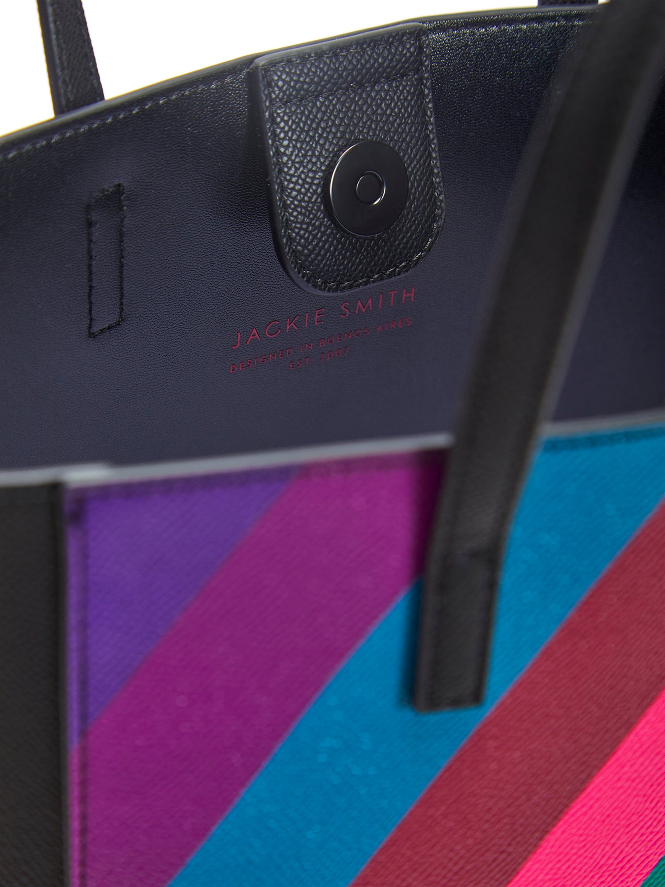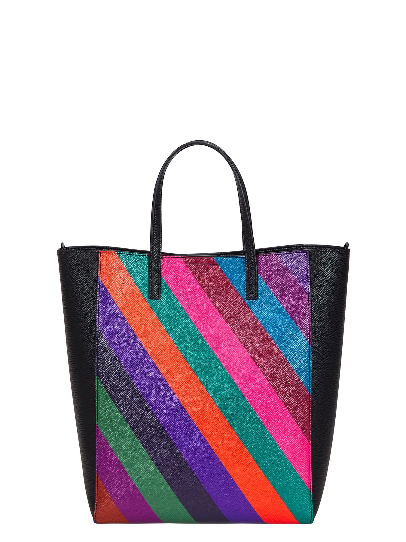 Inspirada en las escenas urbanas y nuestra conexión con el diseño gráfico y el color, nace esta Colección. Confeccionada en PU grabado, esta tote bag liviana y versátil destaca por nuestro signature print de rayas oblicuas multicolores. Su strap regulable y removible te permite llevarla al hombro o cruzada, para lograr el calce perfecto. Este producto cierra con broche imán y presenta un bolsillo colgante con cierre . Power Up! Corita is here to stay!