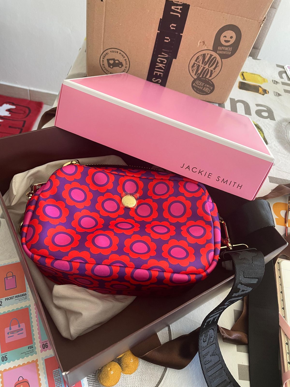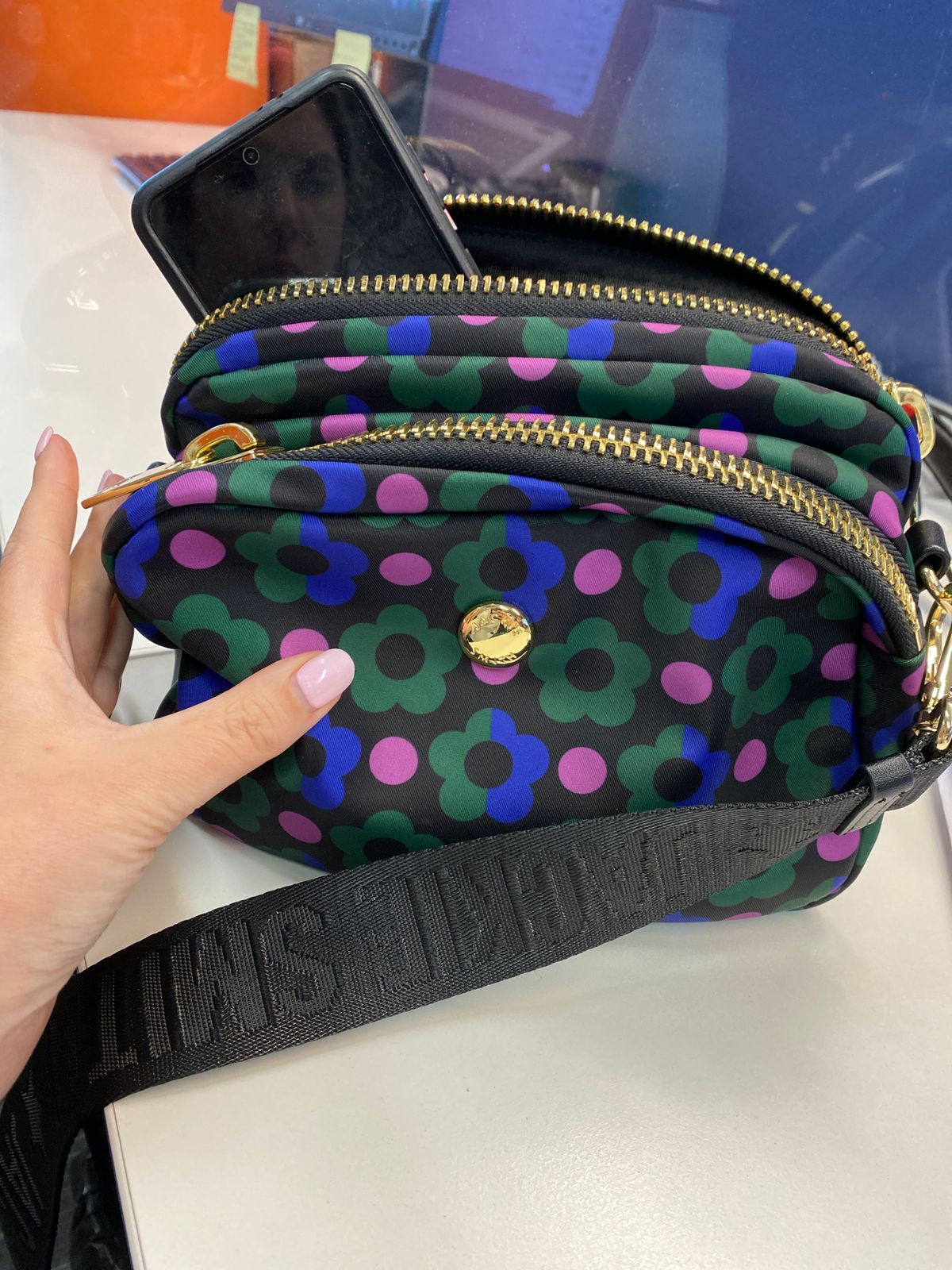Una edición limitada en la que florece nuestro amor por el diseño gráfico y el color, en sus matices más encendidos. Confeccionado en microfibra, fue diseñado como un everyday staple. Sus dos compartimentos con maxi herrajes bañados te permiten llevar organizados tus daily essentials, mientras que su strap regulable en ribbon custom design te permite usarlo también como shoulder bag. Say It With A Pattern.