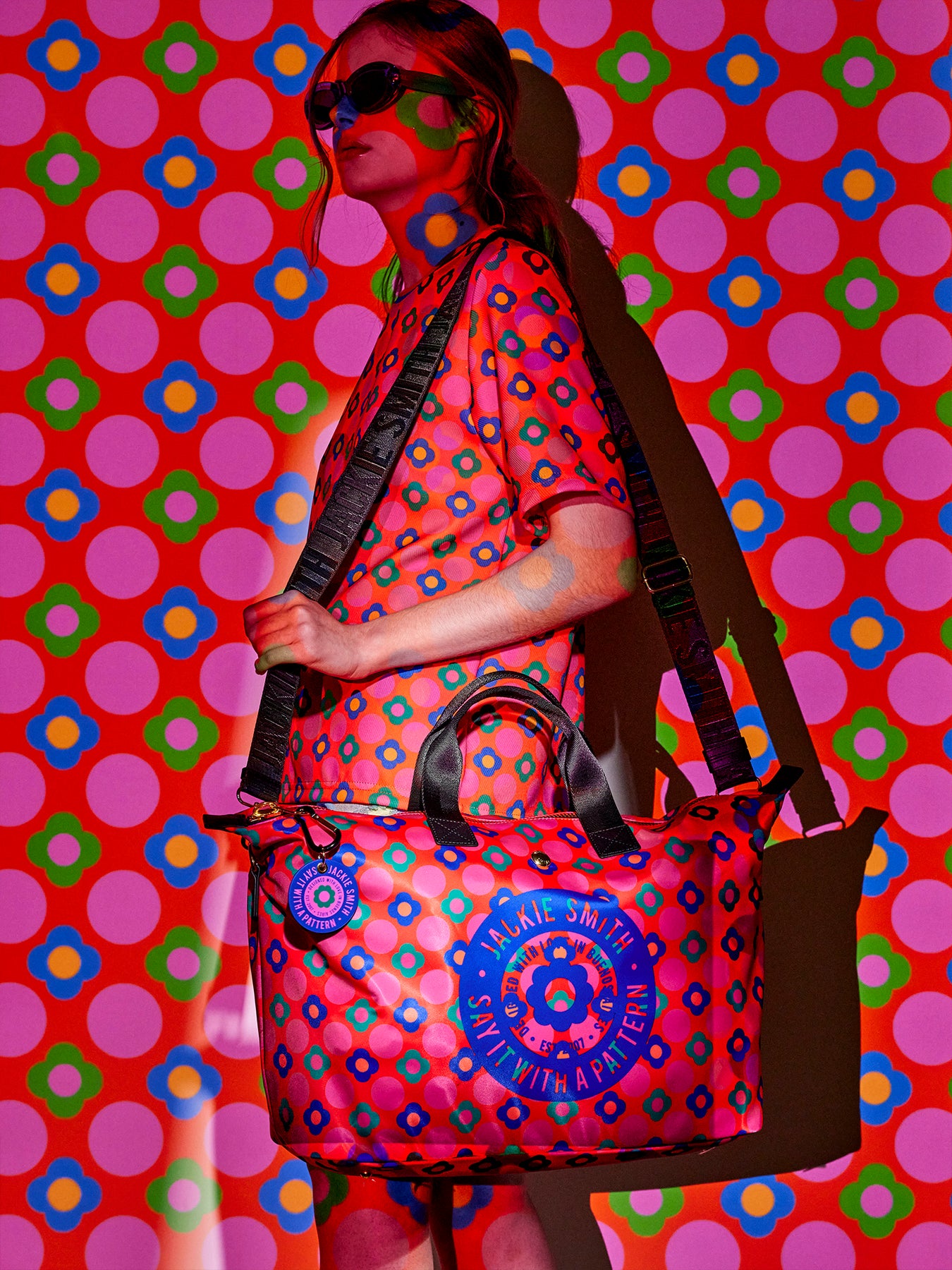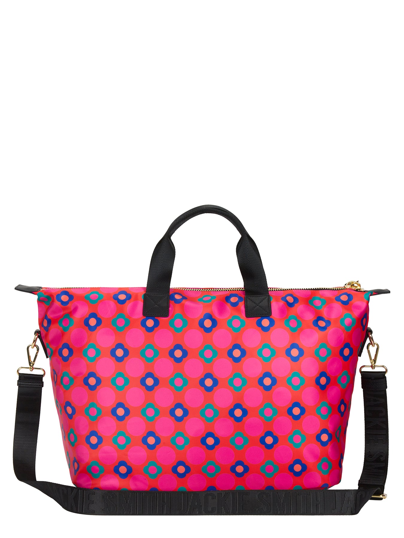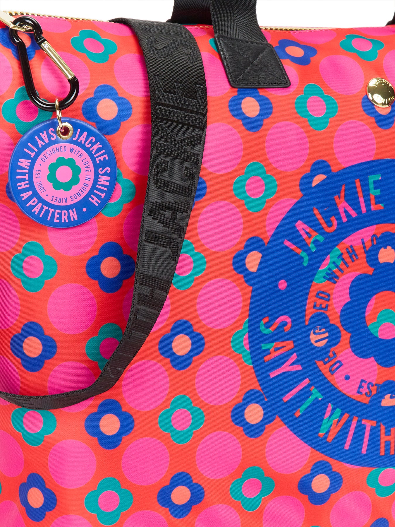 Say It With A Pattern. Una edición limitada en la que florece nuestro amor por el diseño gráfico y el color, en sus matices más encendidos. Confeccionado en microfibra, éste maxi bolso es, a la vez, liviano y suficientemente espacioso para transportar todo lo que necesitás para pasar un fin de semana fuera de la ciudad o (por qué no?) para ir al gimnasio cada día. Podés elegir llevarlo en la mano u optar por cruzarlo haciendo uso de su strap regulable custom design. Herrajes metálicos y un adorable charm aportan el toque justo de “bling” a ésta pieza de colección.