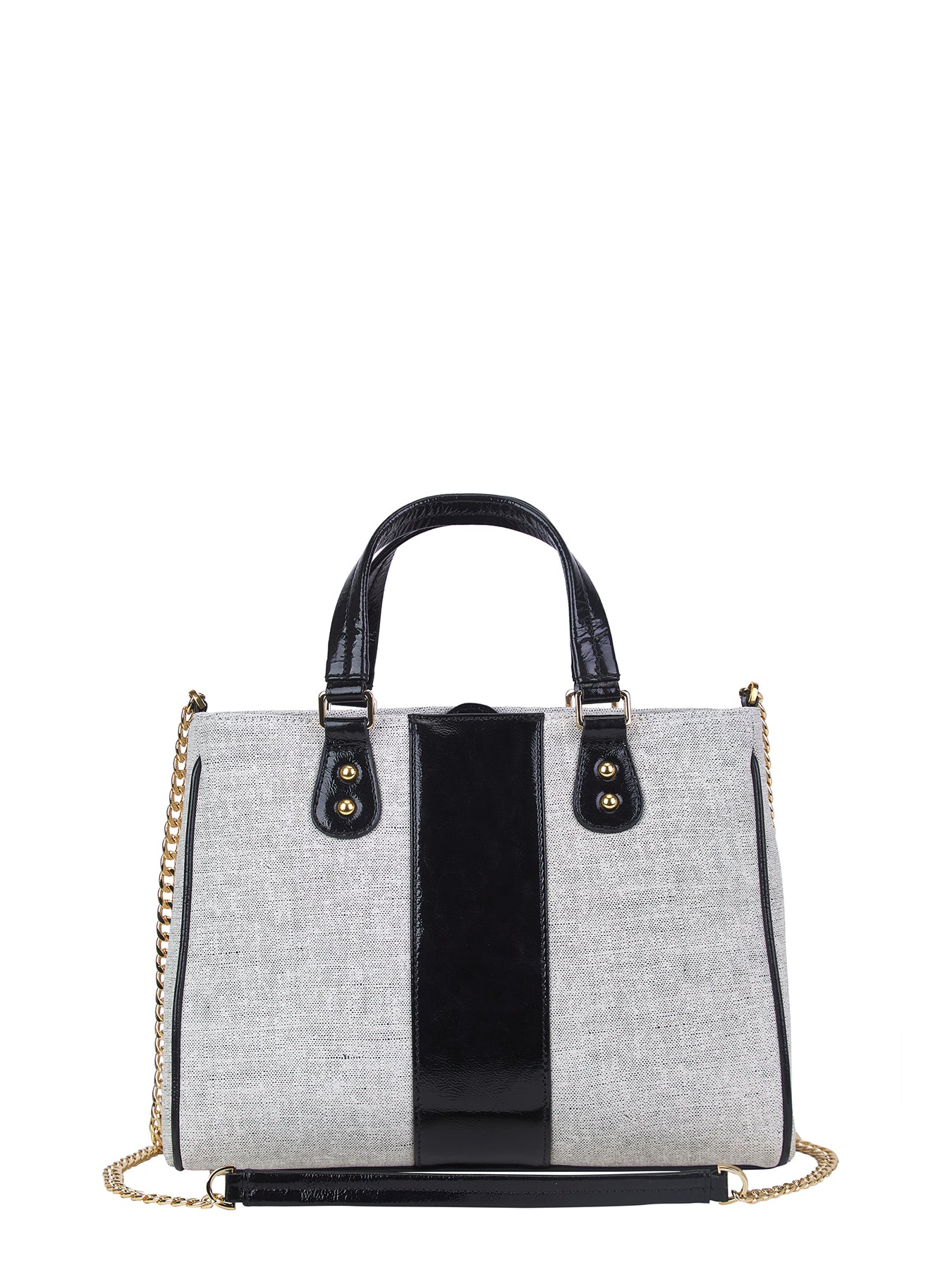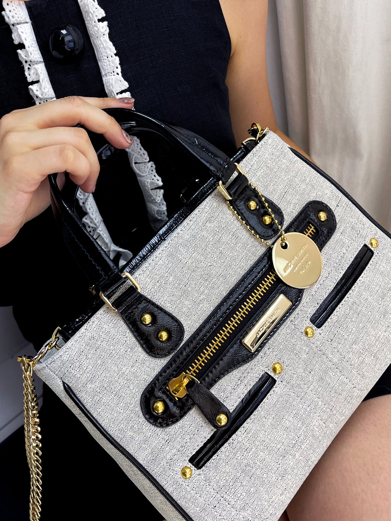 Una tote bag de líneas estructuradas y carácter versátil. Confeccionada en cuero con acabado aterciopelado y detalles en un magnifico charol con efecto arrugado, su superficie seductora al tacto contribuye a una irresistible impronta sofisticada. Su interior, con forrería en satin custom print, ofrece una organización discreta con compartimentos funcionales. Los herrajes bañados en oro y la cadena dialogan con la superficie texturada en un contraste sutil entre sofisticación y energía. Una pieza pensada para acompañar la rutina con elegancia urbana, sea que elijas llevarla al hombro o en la mano, para un look ladylike.