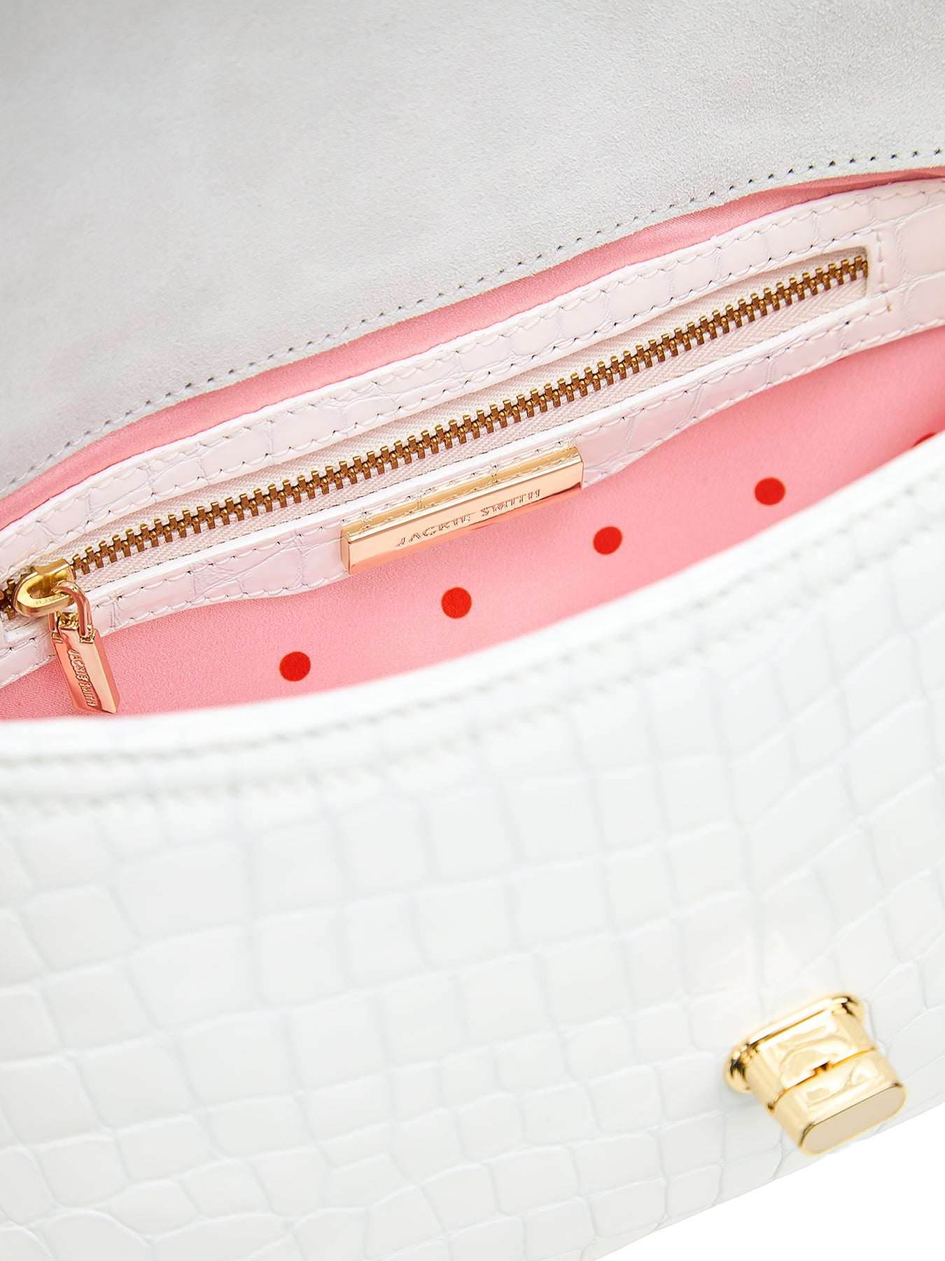 Lupe Limited Edition recibe esta temporada en cuero italiano con acabado glossy efecto crocco, combinando la herencia artesanal de Jackie Smith con una estética de precisión contemporánea. Su superficie luminosa revela un juego de reflejos que resalta la arquitectura depurada de su silueta, mientras sus herrajes y su strap en ribbon custom design introducen un aire urbano refinado. Versátil y magnética, se mueve con soltura entre el día y la noche, encarnando esa elegancia moderna que trasciende temporadas.