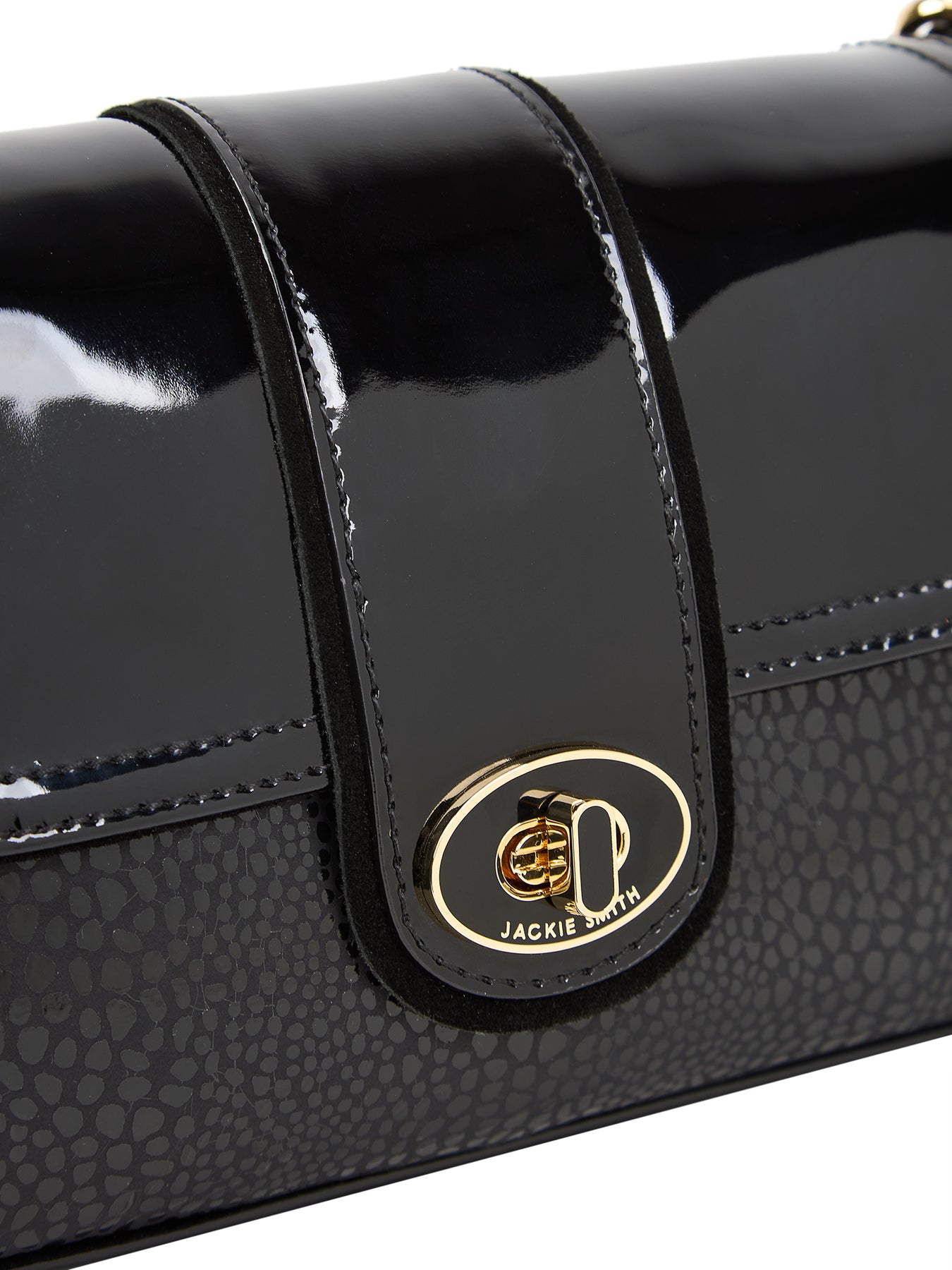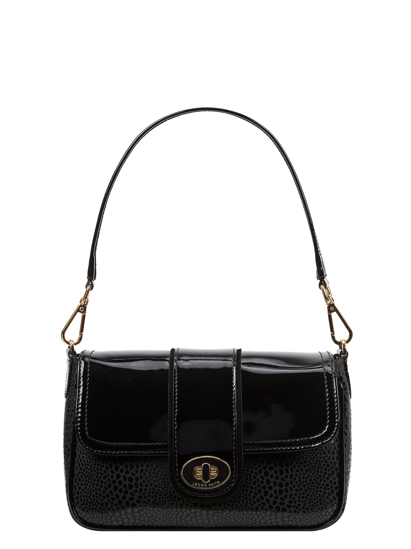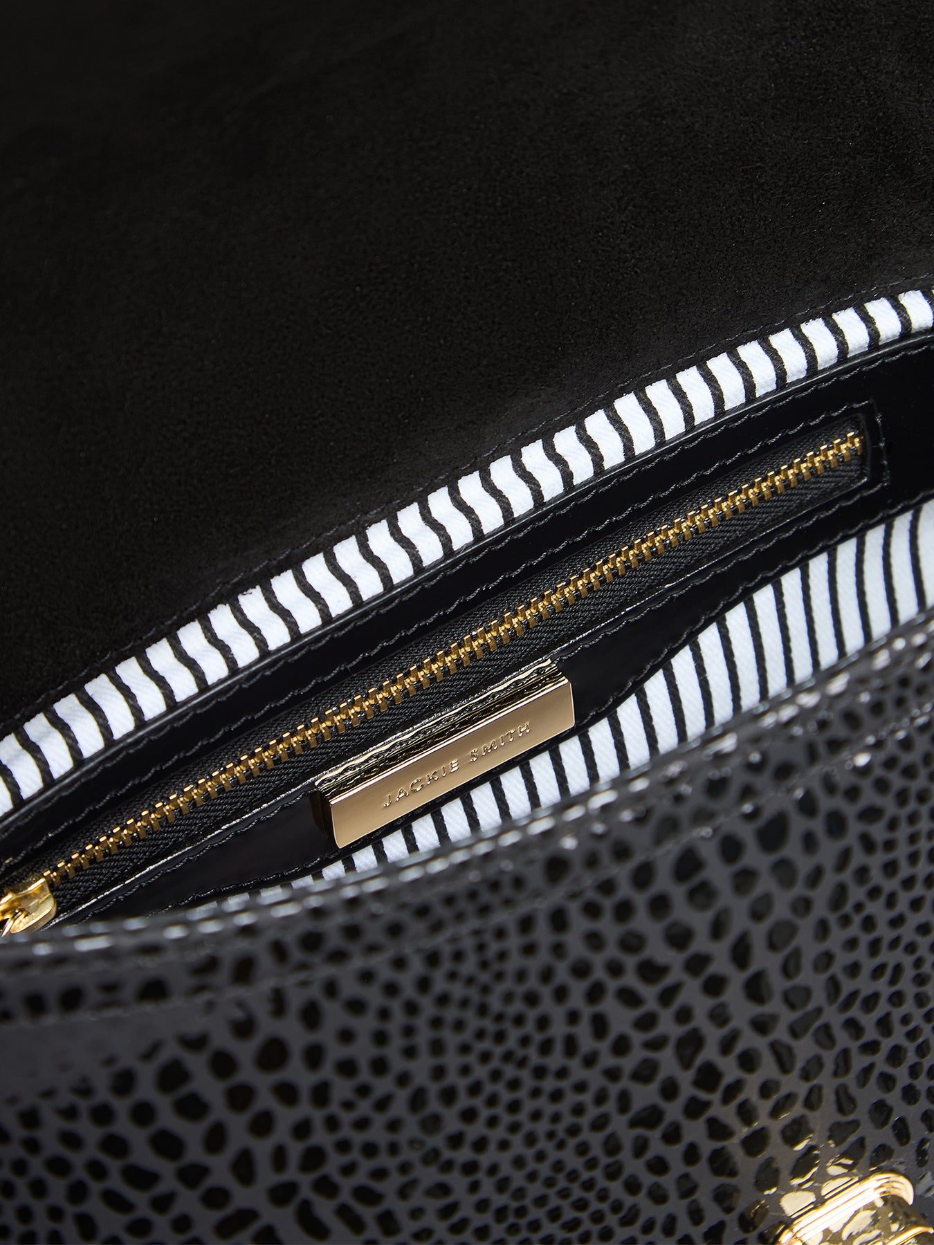 Confeccionada en cuero grabado con acabado sparkle snake combinado con charol y gamuza, esta baguette redefine la sofisticación con un brillo sutil y textura envolvente. Su cierre con solapa y torniquete esmaltado aporta estructura y equilibrio, mientras el interior de satén guarda lo esencial con elegancia serena. Los herrajes bañados en oro y su strap regulable brindan a la pieza un gesto contemporáneo. Una creación que celebra la fuerza del detalle y la elegancia que se mueve con naturalidad entre el día y la noche.